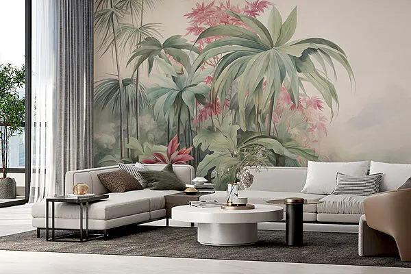 Papel de parede Pintura de uma paisagem com árvores e plantas