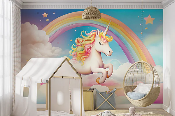 Papel de parede Unicórnio de brinquedo com um arco-íris em fundo