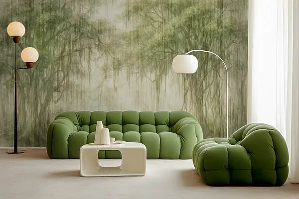 Papel de parede Pintura de uma floresta com árvores e montanhas