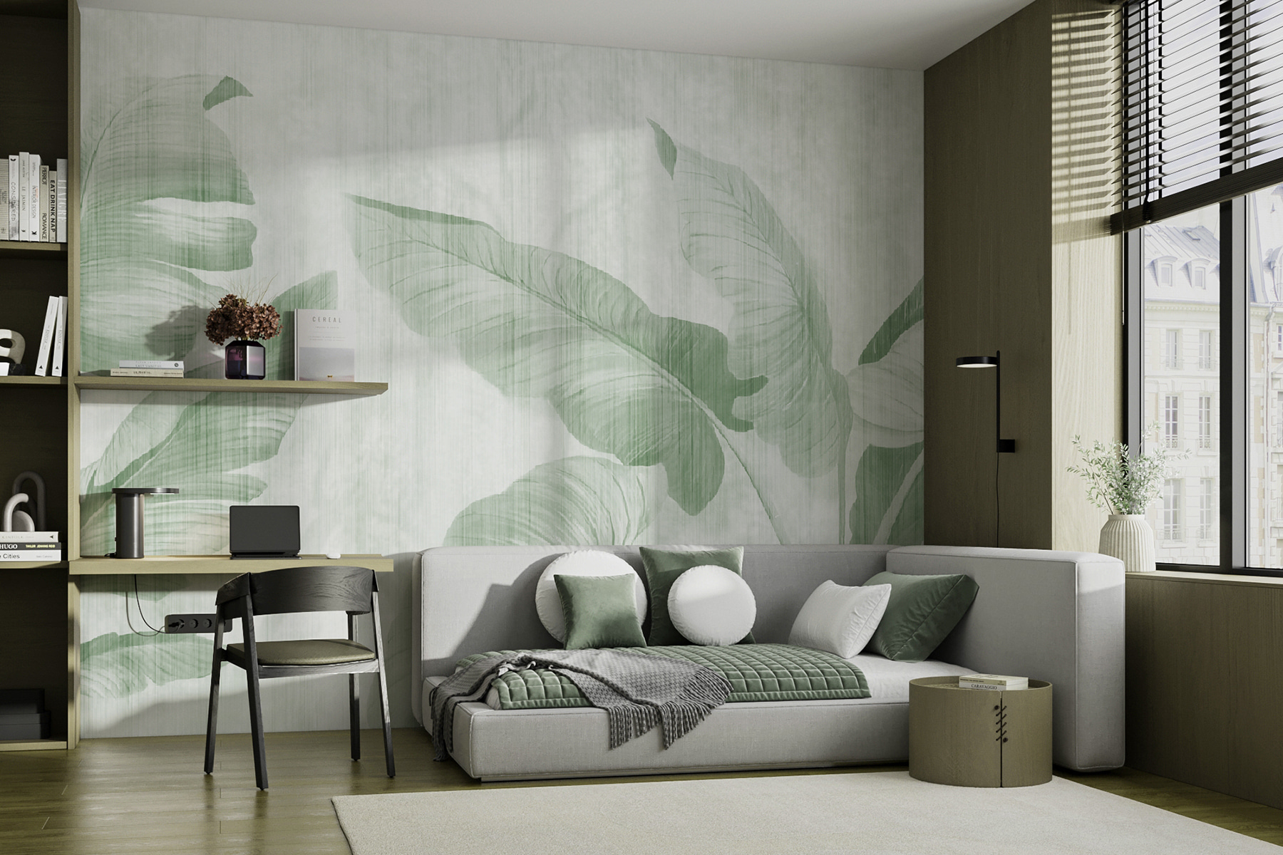 Transforme qualquer divisão num oásis sereno com este mural cativante de folhas verdes exuberantes sobre um fundo subtilmente encantador. Imagine-se a entrar num retiro tropical mesmo em sua casa – não é necessário passaporte. Perfeito para dar um toque de frescura ao seu espaço de vida, parece que a natureza está a espreitar. Quer se trate de um recanto de leitura acolhedor ou de uma parede de afirmação arrojada, este design traz uma sensação de paz e calma. Os amigos podem até perguntar se tem um jardim secreto. É um ótimo início de conversa! Além disso, quem é que não gosta de um pouco de magia folhosa para acordar todos os dias?