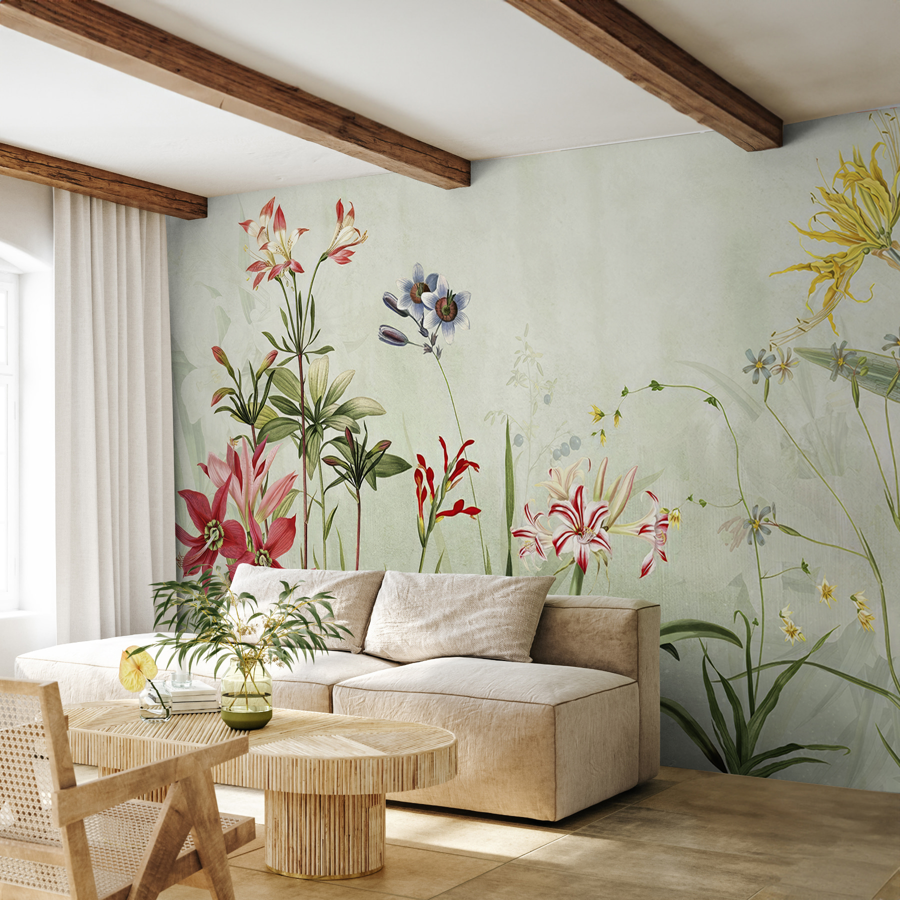 Imagine ter um pedaço do paraíso mesmo em sua casa… Este mural “Elegant Floral Symphony in Bloom” é como trazer o seu jardim para dentro de casa, mas sem os insectos! É perfeito para quem gosta de flores, mas talvez não tenha o polegar mais verde. As delicadas aguarelas dançam na parede, dando um toque de beleza natural a qualquer espaço – sala de estar, quarto, o que quiser. Quer esteja a beber café de manhã ou a relaxar ao fim do dia, estas flores criam um cenário sereno que melhora instantaneamente o ambiente. Além disso, é um truque fantástico para fazer com que uma divisão pequena pareça mais espaçosa. Quem não gostaria de se sentir como se estivesse num prado solarengo durante todo o ano? Coloque algumas luzes de fadas, coloque uma cadeira confortável e terá um pequeno santuário acolhedor.
