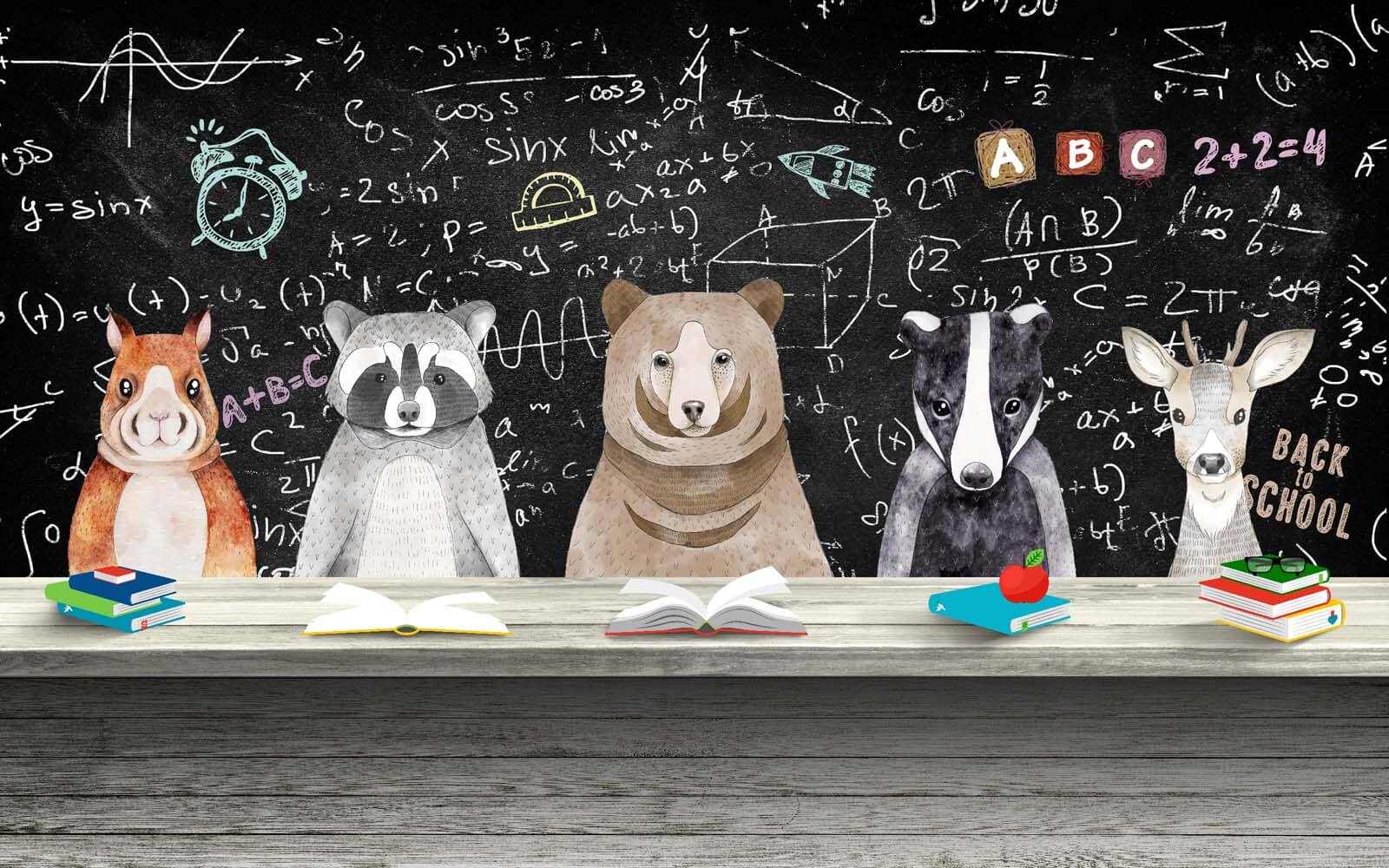 Entre numa sala de aula fantástica onde a natureza e a aprendizagem se encontram! Este encantador mural, com adoráveis alunos animais — pense em guaxinins, ursos e um velho veado sábio —, tem como pano de fundo um quadro negro cheio de equações e letras divertidas. É como uma divertida atmosfera de regresso às aulas todos os dias, perfeita para o quarto de uma criança ou um espaço de trabalho criativo. Imagine as risadas das crianças enquanto tentam estudar ao lado de seus amigos peludos. As cores suaves e o tema alegre trazem aconchego, fazendo você se sentir em casa. Além disso, quem não gostaria de ter um urso cuidando da sua lição de casa? É educativo e super fofo, adicionando um toque de alegria a qualquer parede!