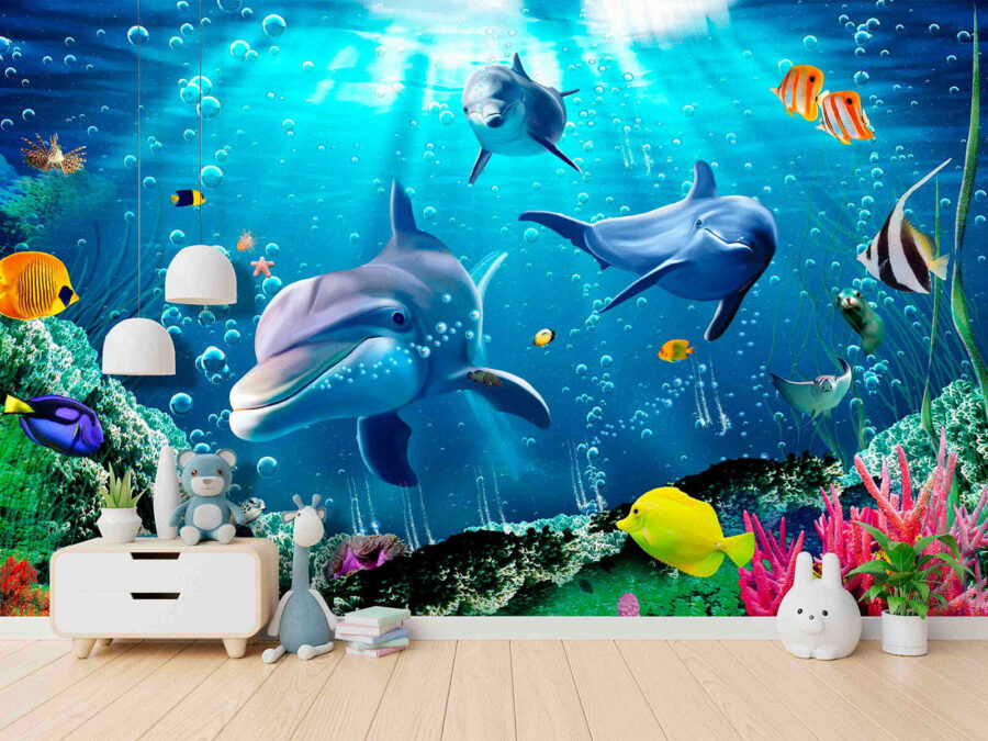 Imagine mergulhar num mundo subaquático vibrante sem sequer sair do seu quarto – parece fantástico, não é? Este mural “Golfinho a nadar na água” é como uma explosão de magia oceânica para as suas paredes. Golfinhos, peixes coloridos, corais – é como uma pequena aventura mesmo no seu espaço! Perfeito para quartos de crianças ou para quem é jovem de coração, traz um toque de alegria e maravilha. O efeito 3D dá-lhe a sensação de estar quase a molhar os pés… e, sinceramente, quem não gostaria de nadar com golfinhos todos os dias? Mergulha e dá largas à tua imaginação!