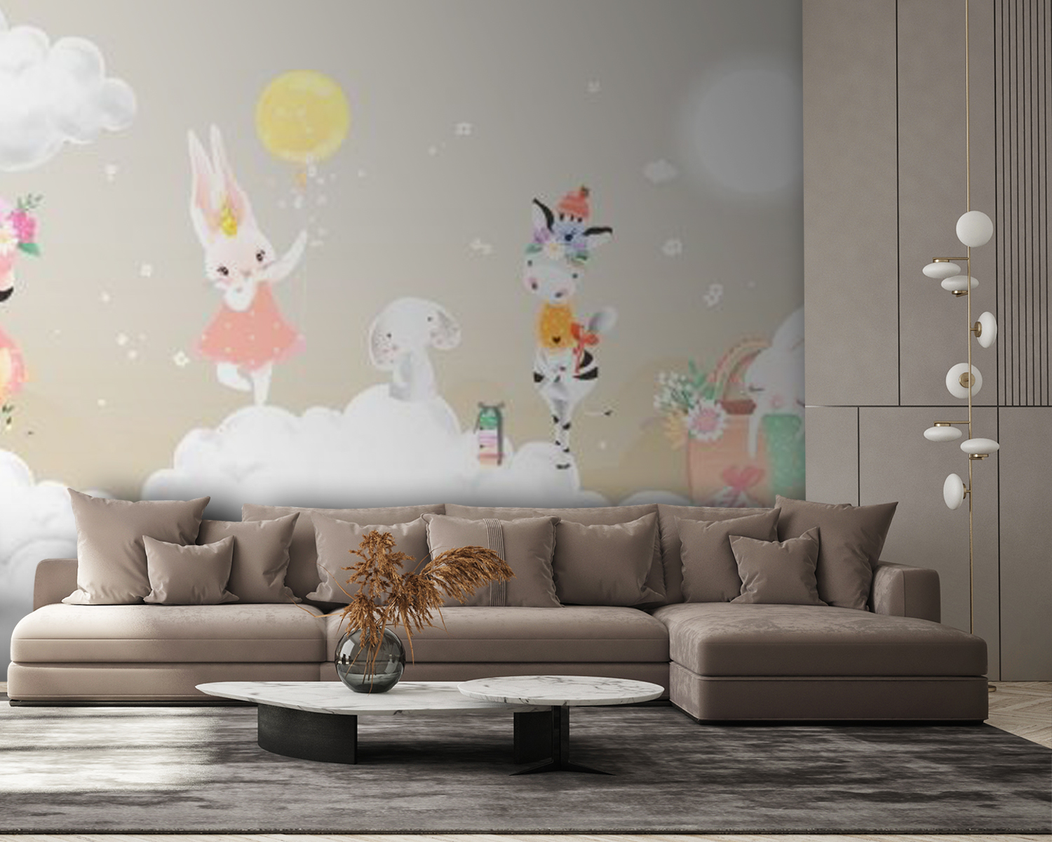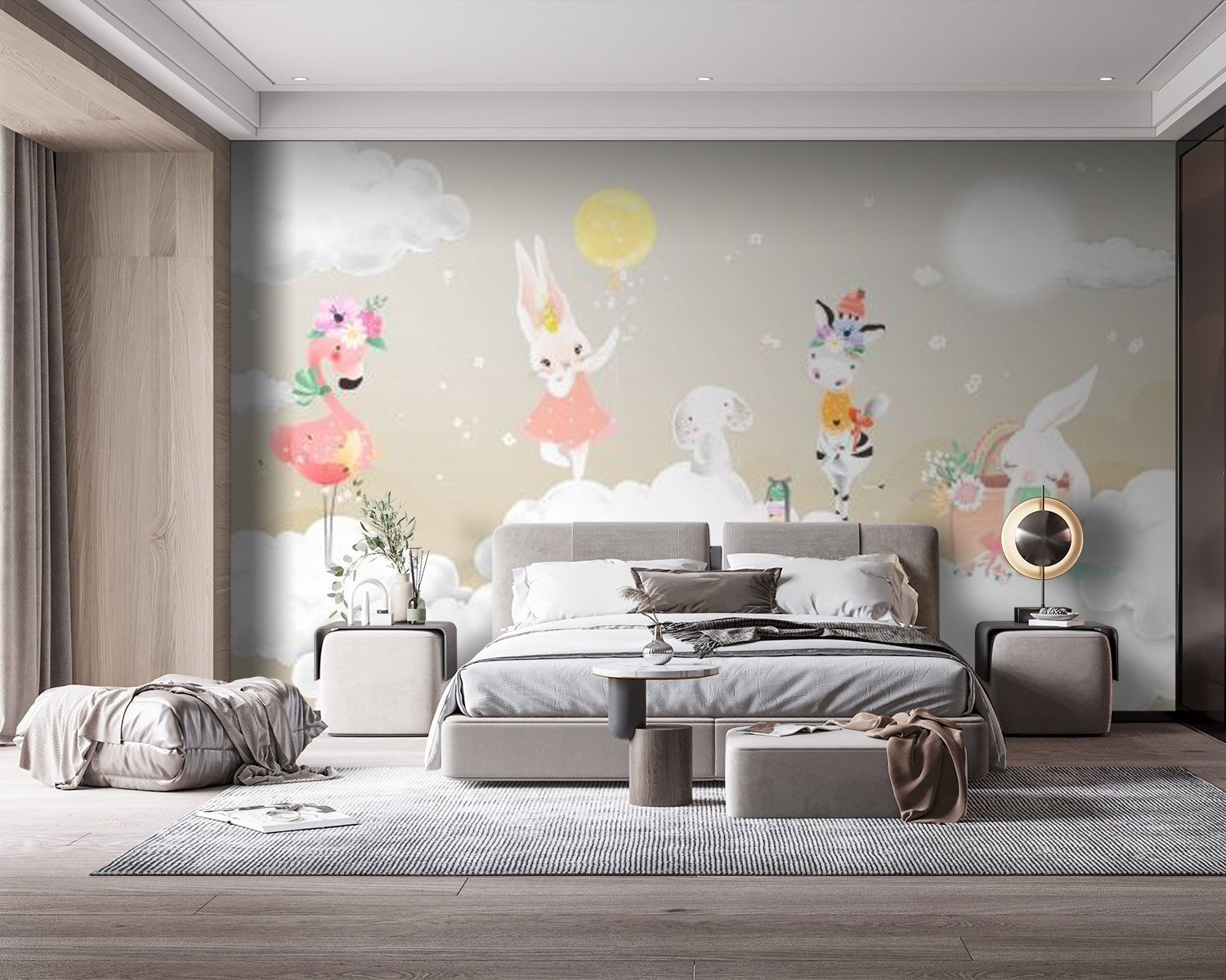 Transforme uma parede sem graça num paraíso de sonho com este mural encantador que apresenta um grupo caprichoso de animais a brincar em nuvens fofas. Imagine: um flamingo brincalhão, um coelho encantador com um vestido cor-de-rosa e uma zebra com um pequeno chapéu – apenas a descansar no céu como se fossem os donos do lugar. Este mural traz uma vibração calorosa e alegre que pode despertar a alegria em qualquer divisão, desde um berçário animado a um recanto de leitura acolhedor. Parece um abraço para as paredes, envolvendo os espaços numa sensação de maravilha e imaginação. Quem não sorriria sempre que passasse por lá? Perfeito para os corações que adoram uma decoração única e uma pitada de magia.
