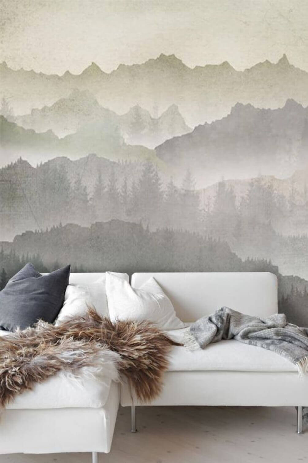 Imagine entrar no seu quarto e sentir a brisa suave de um refúgio nas montanhas, mesmo em casa. Este impressionante mural de parede, com pássaros voando sobre uma cordilheira enevoada, traz uma sensação de calma e serenidade difícil de resistir. O efeito aquarela suaviza as bordas, misturando os tons frios de verde e cinza, fazendo com que o espaço pareça maior e muito mais convidativo.