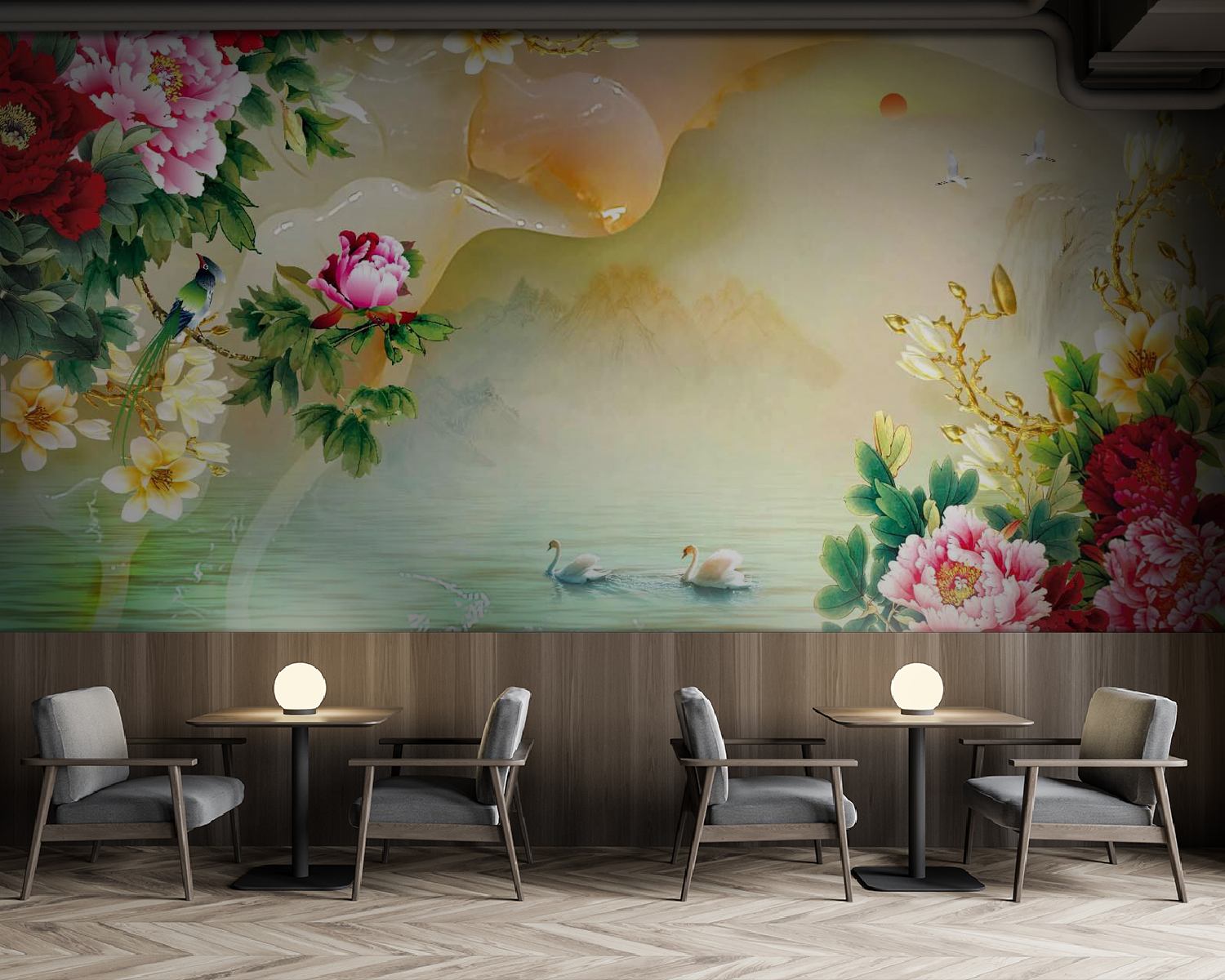 Transforme qualquer espaço num oásis tranquilo com este encantador mural de parede com flores vibrantes e cisnes graciosos. As flores de peónia destacam-se com cores vivas, criando uma atmosfera animada, enquanto os cisnes serenos deslizam sobre uma superfície de água de sonho, convidando a um olhar relaxante durante a tarde. Imagine-se a beber chá aqui, sentindo-se como se tivesse entrado numa pintura em aguarela. Esta peça é perfeita para paredes de destaque ou recantos acolhedores, combinando sem esforço a beleza da natureza com a sua decoração. Não é apenas arte; é um convite para fazer uma pausa, respirar e desfrutar um pouco mais da vida.