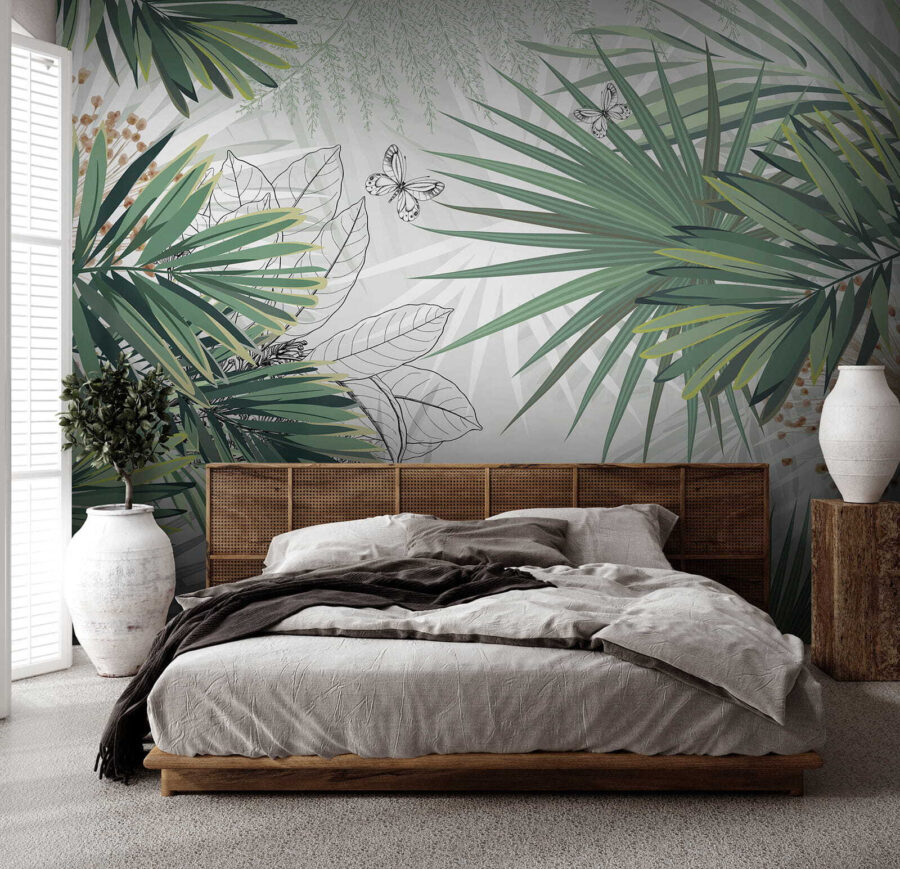 2 avaliações de Papel de parede Ilustração de folhas e borboletas tropicais