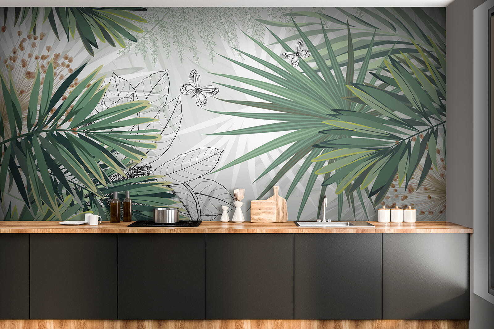 2 avaliações de Papel de parede Ilustração de folhas e borboletas tropicais