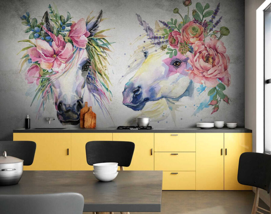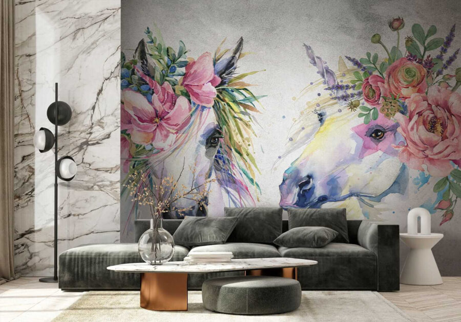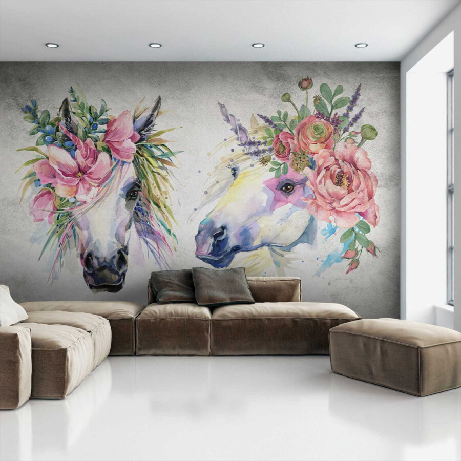 Imagine entrar numa sala e ser recebido por estes cavalos espantosos adornados com coroas florais! Este mural de parede vibrante traz uma explosão de cor e capricho a qualquer espaço – perfeito para o quarto de uma criança, um berçário, ou mesmo um estúdio criativo. A sensação de aguarela é simplesmente sonhadora, quase como se tivesse entrado num jardim de conto de fadas. As flores delicadas e os olhos expressivos dos cavalos dão um toque de magia e serenidade a que é difícil resistir.