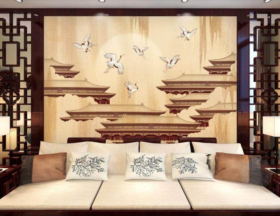 Imagine entrar numa sala adornada com este deslumbrante mural de grous a voar graciosamente no céu. Cada ave parece ter sido apanhada num momento de liberdade, deslizando sobre elegantes telhados que sussurram histórias de terras distantes. Este mural não se limita a decorar a parede; transforma todo o espaço, convidando à paz e à serenidade.