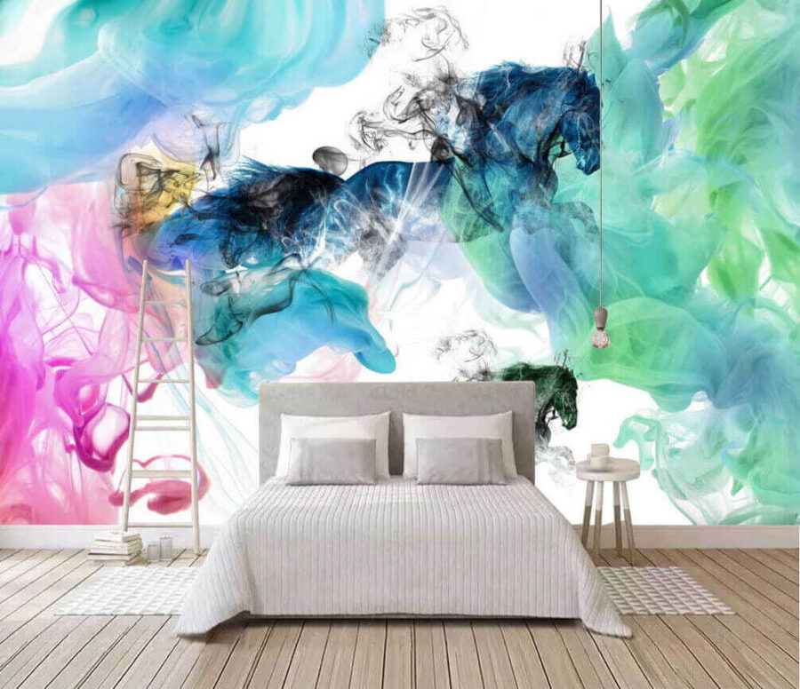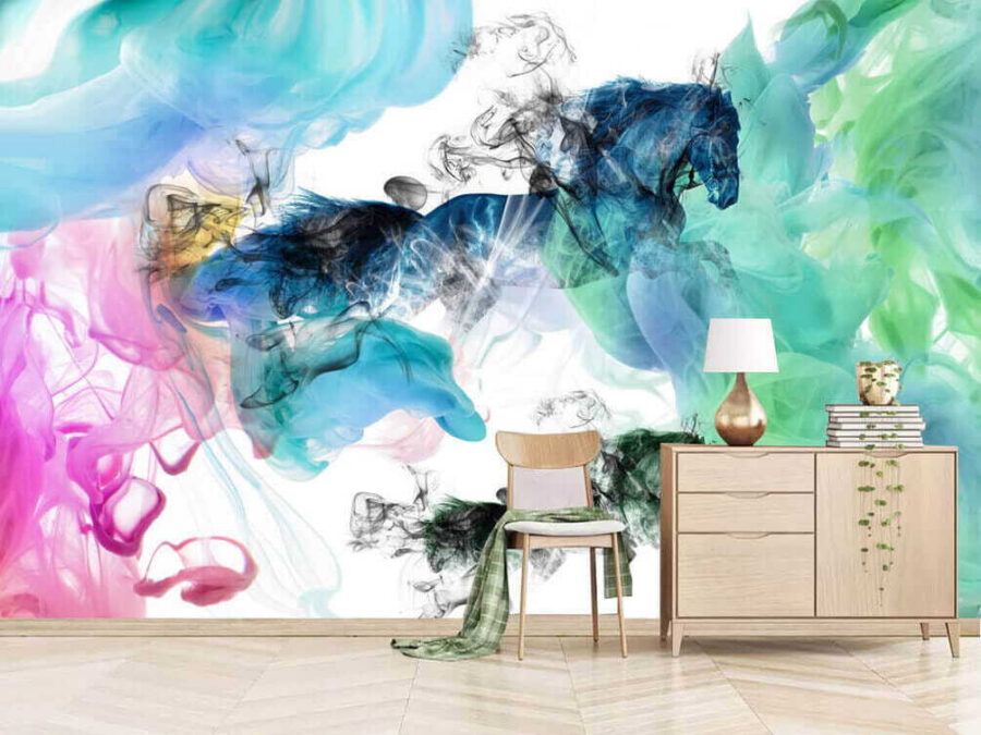 Transforme qualquer espaço com este mural cativante de cavalos a dançar por entre nuvens de fumo coloridas. É como um devaneio selvagem onde a arte e a imaginação colidem. Os tons vibrantes – como os azuis misturados com os rosas divertidos – trazem energia e charme, tornando-o certamente num ponto de partida para uma conversa. Imagine-o num recanto de leitura acolhedor ou numa parede de afirmação arrojada. Pode inspirar uma festa de dança improvisada ou serões calmos com um livro e uma chávena de chá. A cada olhar, sentir-se-á um pouco mais vivo, como uma lufada de ar fresco em sua casa. Além disso, quem não gosta de um cavalo a galopar por entre uma nuvem colorida? Isto é que é uma vibração!