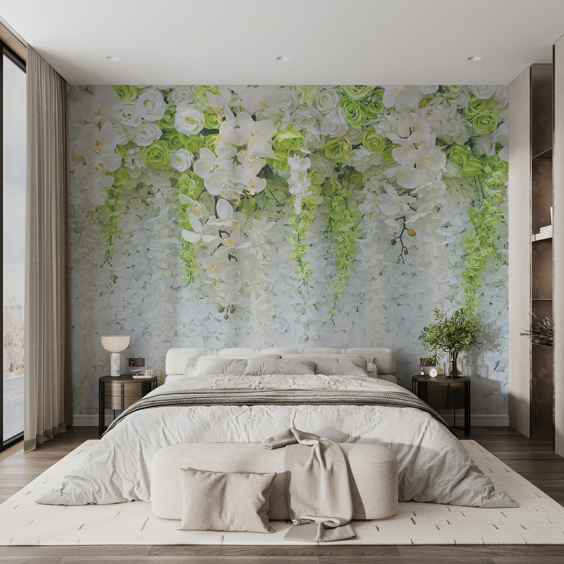 Imagine entrar numa sala e ser recebido por uma deslumbrante cascata de flores brancas e verdes que adornam a sua parede. Este mural “Grupo de flores brancas e verdes” é como entrar num jardim sereno sem sair de casa. O pormenor é impressionante – quase parece que se pode estender a mão e tocar nas pétalas. É perfeito para dar um toque suave e natural a qualquer divisão.