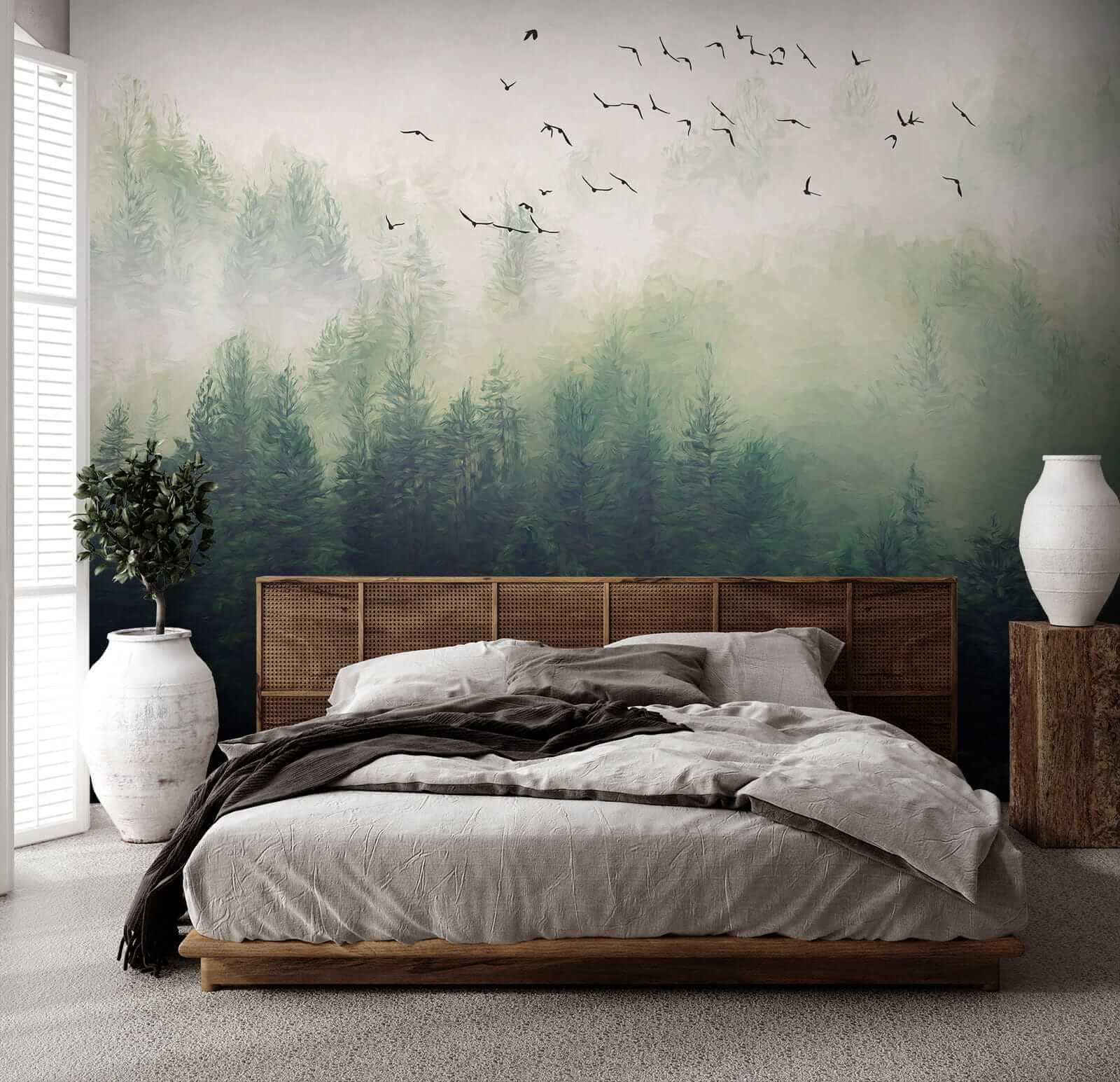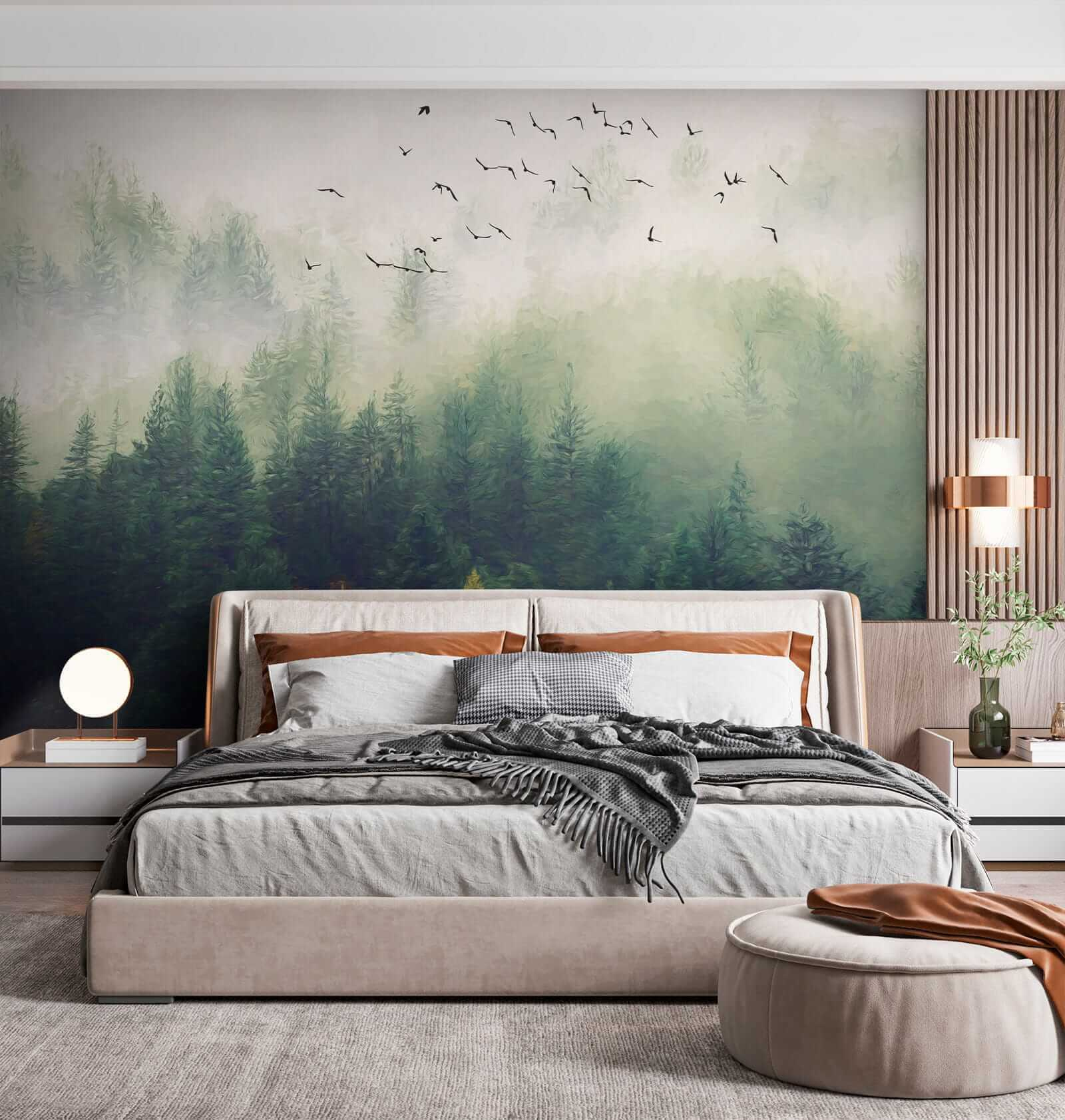 Transform your space with this stunning mural featuring birds soaring over a misty forest. Imagine stepping into a serene escape right in your living room! The gentle greens and soft fog wrap around you like a cozy blanket, while the birds seem to invite you to join their journey. It’s like nature decided to home decor itself!