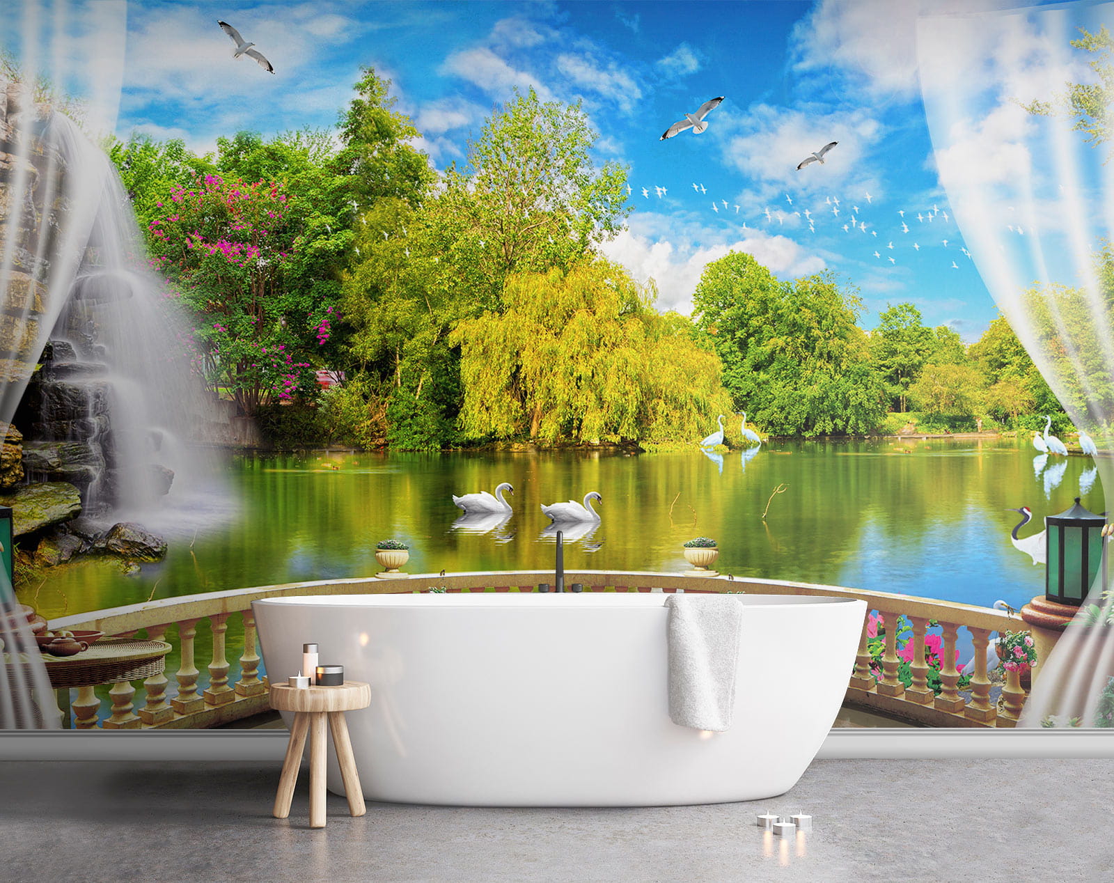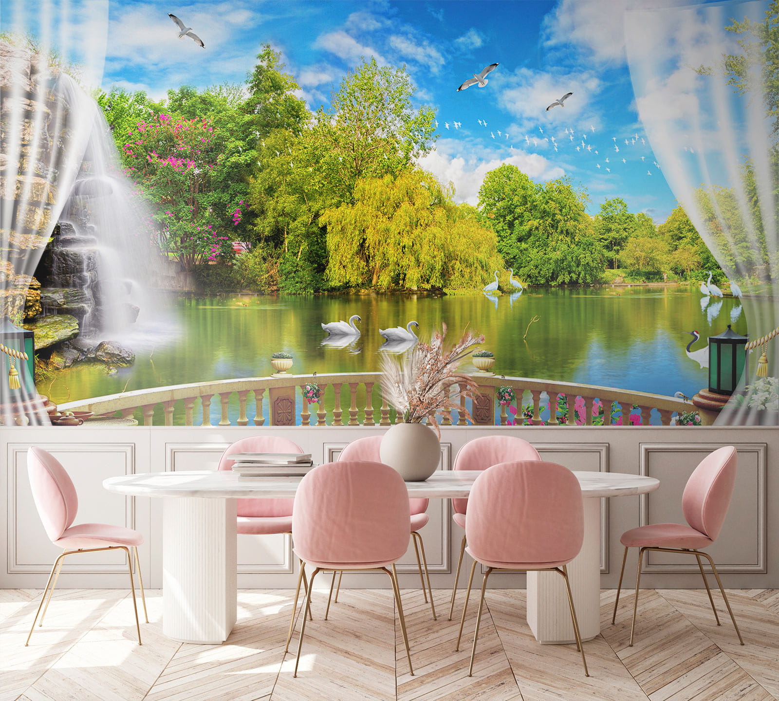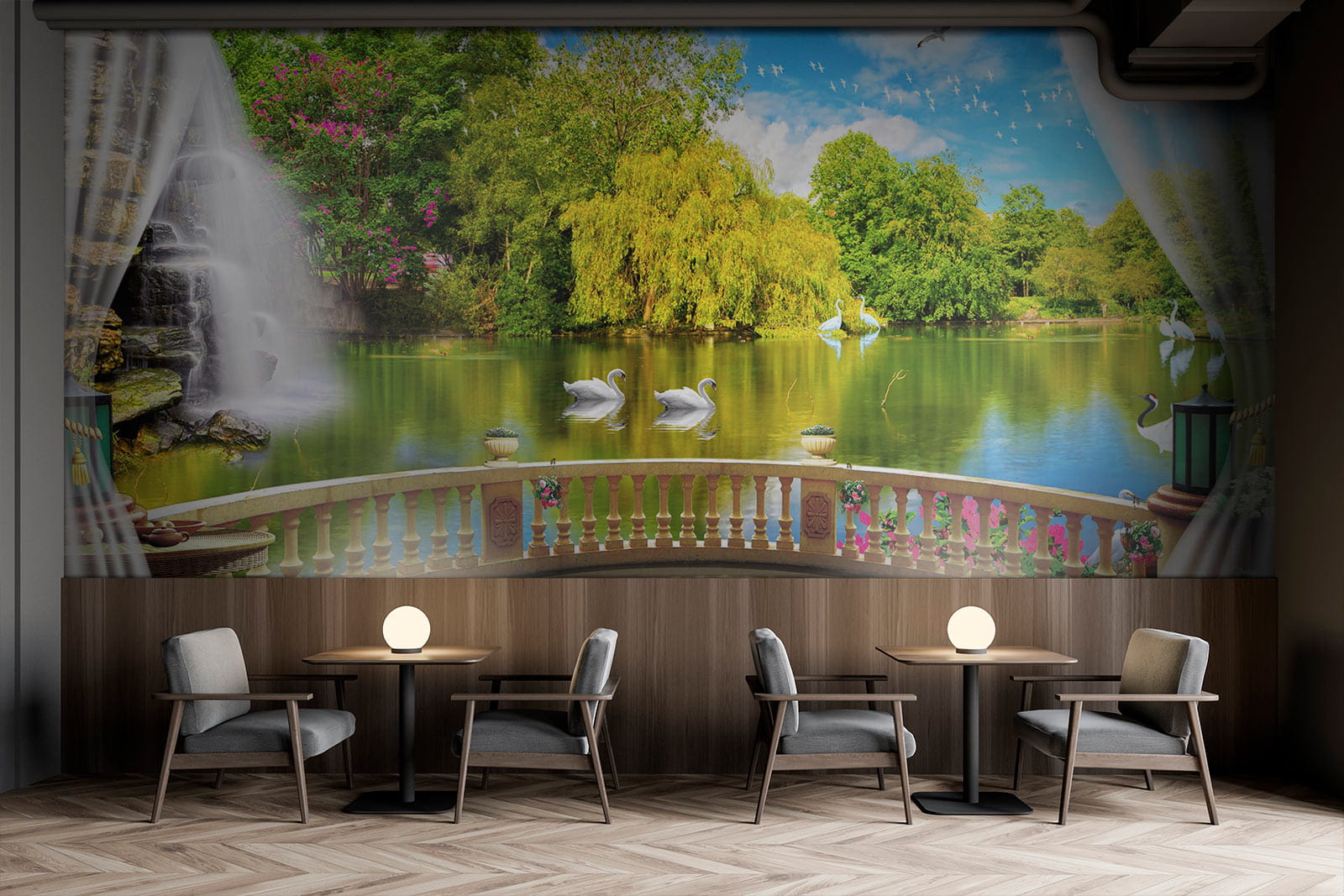 Transform any room into a tranquil oasis with this charming mural, “View of a Pond with Birds and Trees.” Imagine sipping your morning coffee, and suddenly the chaos of the world fades—just you, serene waters, and graceful swans gliding by. The vibrant greens and lively blues bring nature right to your walls, making every day feel like a leisurely stroll by the water. Perfect for a cozy nook or a vibrant living room, this mural isn’t just decor; it’s a little slice of peace that whispers, “Take a breath, you deserve it.” Isn’t it time to embrace those calming vibes?