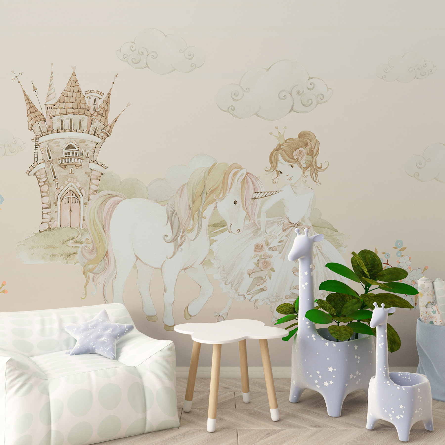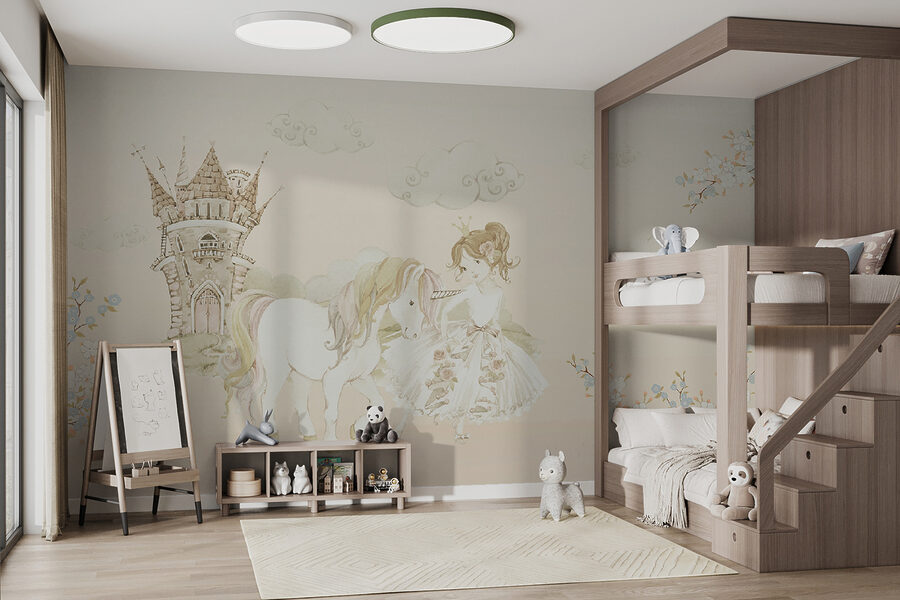 Imagine uma parede que o transporta diretamente para um conto de fadas caprichoso – um castelo ao longe, uma princesa com o seu fiel unicórnio ao seu lado. Este mural é como entrar numa história de sonho sempre que entra na sala. Os pastéis suaves e os pormenores delicados são simplesmente… mágicos. Perfeito para o quarto de uma criança ou para qualquer pessoa que goste de um pouco de encantamento na sua vida. Além disso, aquelas nuvens fofas e flores doces? Farão com que todos os dias pareçam um dia de sol numa terra de contos de fadas. Uma peça que desperta a imaginação e sorrisos instantâneos!