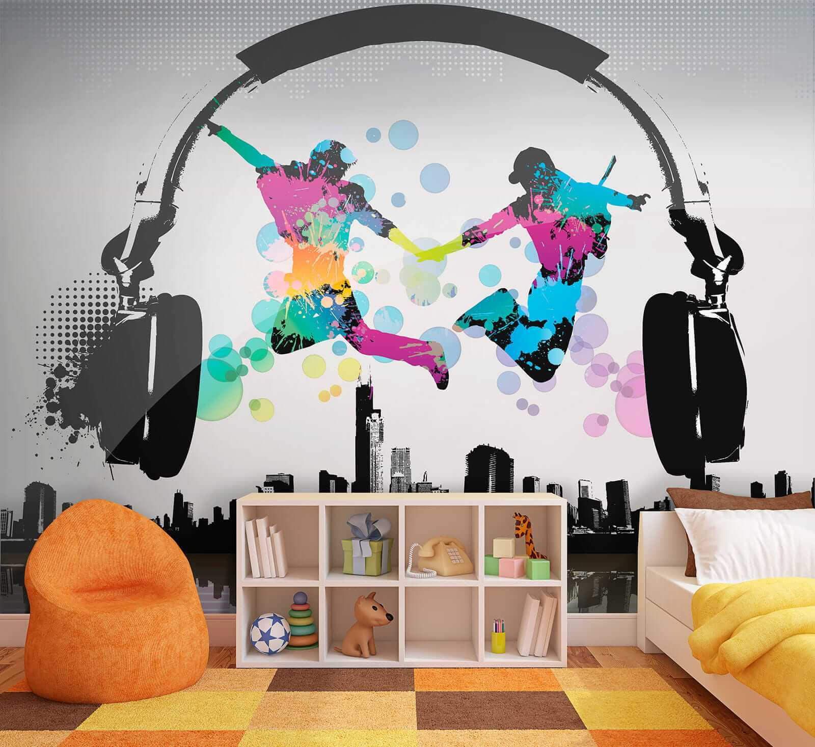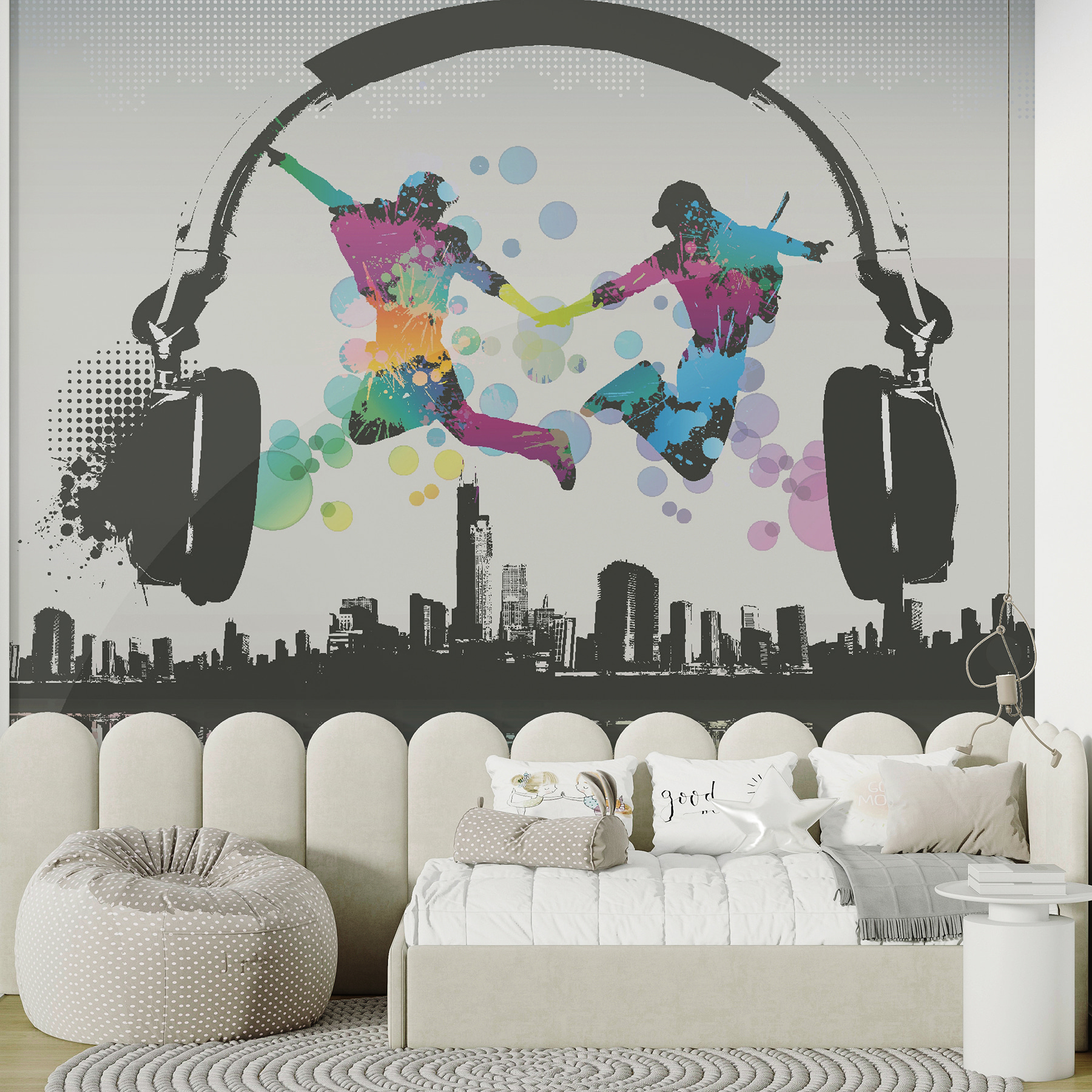 O design apresenta duas figuras a saltar exuberantemente contra um pano de fundo de paisagem urbana e auscultadores gigantes – é como se estivessem a dançar ao seu próprio ritmo, convidando todos os que os vêem a juntarem-se à diversão. Os salpicos de cor arrojados vão imediatamente chamar a sua atenção e levantar o seu espírito! Além disso, está em categorias como “Papel de parede de designer para parede” e “Murais de parede populares”, por isso sabe que está a fazer algo especial.
