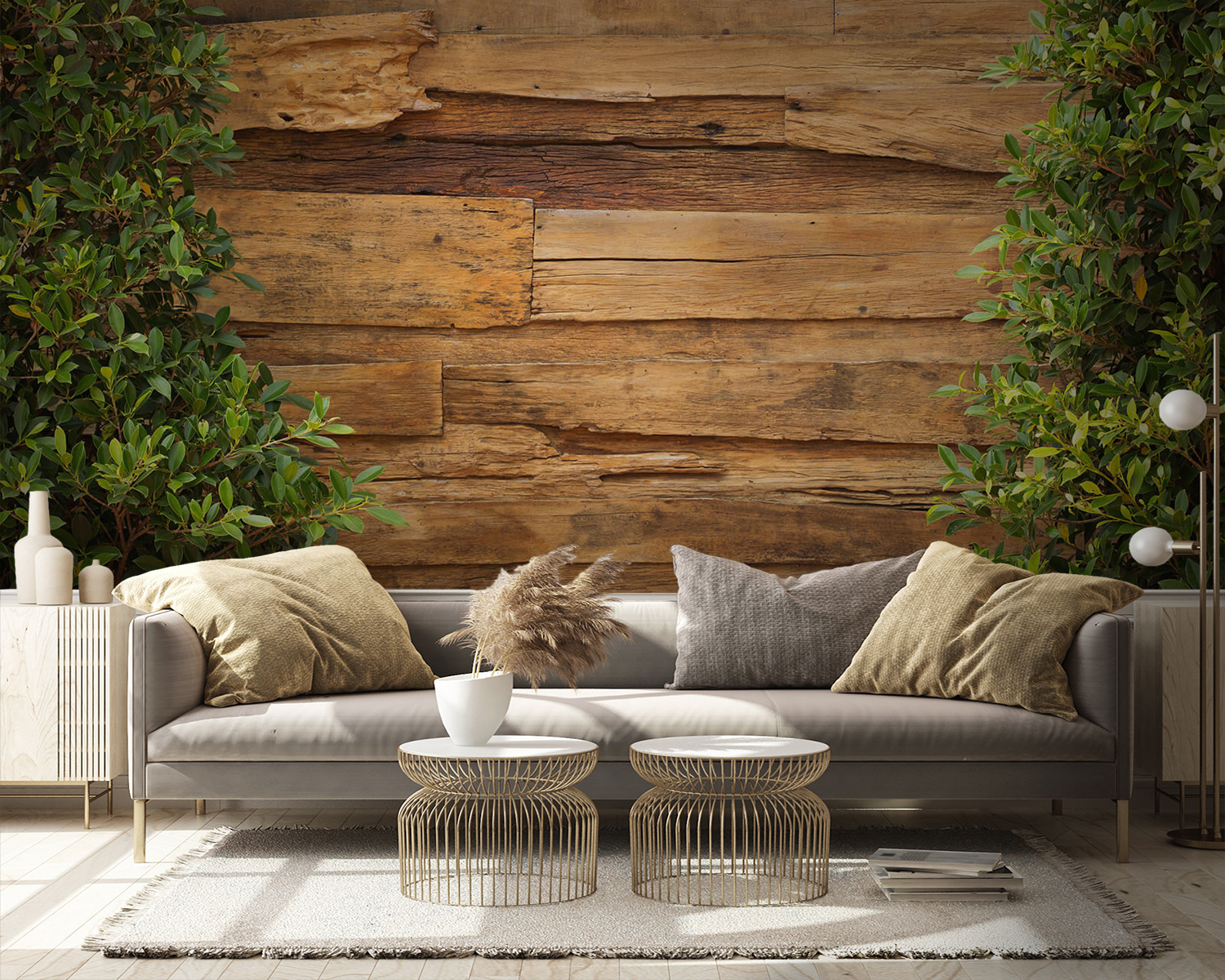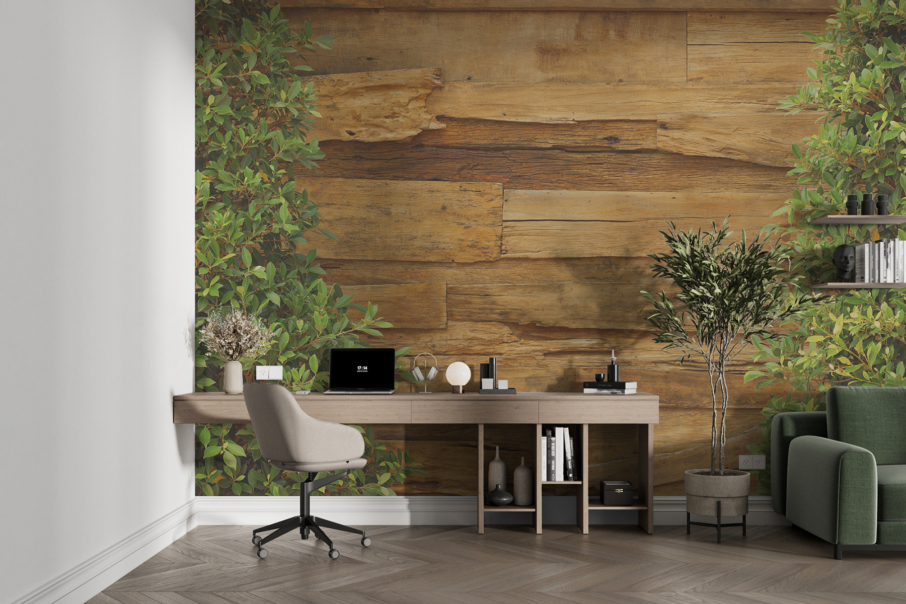 Imagine trazer o encanto de uma parede de madeira rústica e envelhecida diretamente para a sua casa – com um toque especial. Este mural “Weathered Wooden Wall with Greenery” é como envolver-se numa vibração de cabana acolhedora, mesmo na sua sala de estar! A madeira parece velha da melhor maneira, cheia de carácter e história, e aquelas folhas verdes? Fazem-no sentir vivo, como se a natureza estivesse a espreitar para o seu espaço.