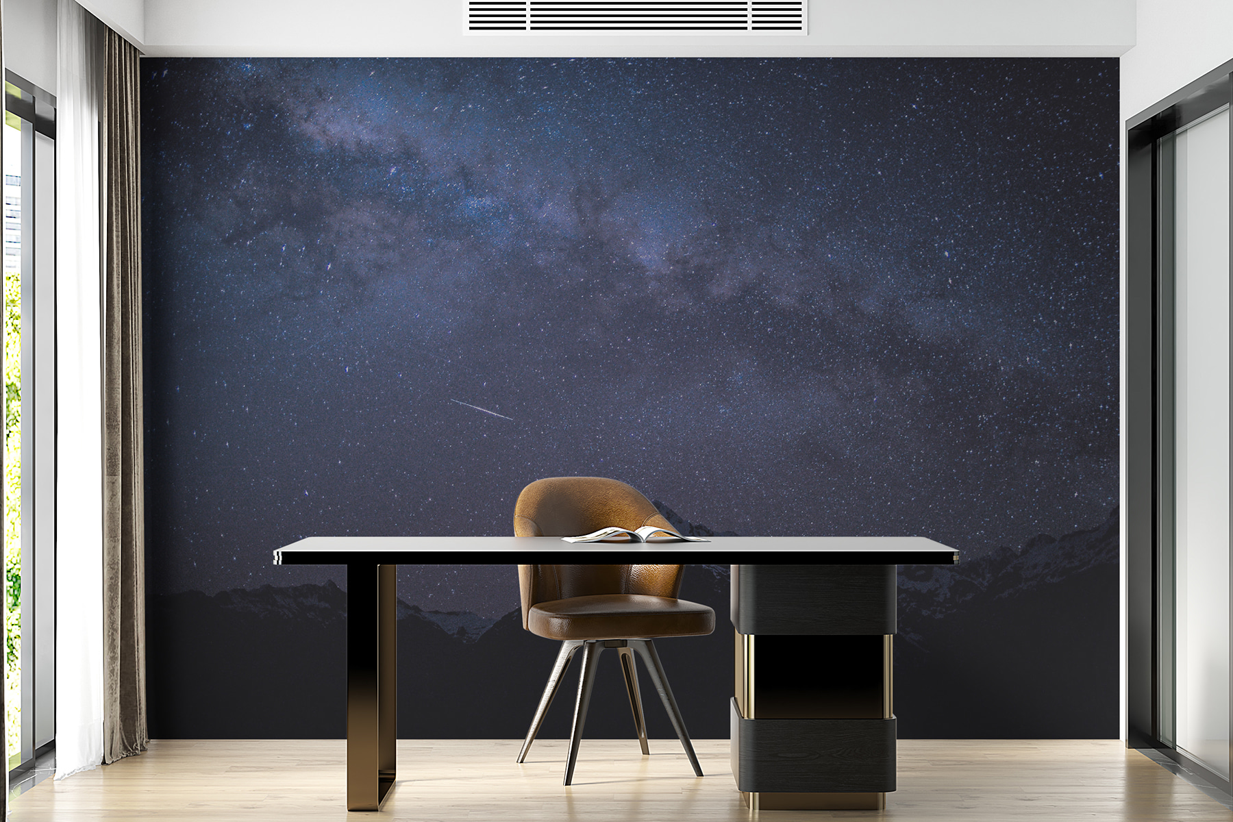 Imagine entrar num refúgio acolhedor onde as montanhas irregulares se encontram com um punhado de estrelas – sim, é essa a magia deste mural! Transforma a sua parede numa paisagem nocturna de cortar a respiração, convidando a calma das montanhas para o seu espaço. Imagine uma poltrona acolhedora, talvez uma bebida quente na mão, enquanto os olhos se desviam para os picos que parecem sussurrar segredos do universo. É como ter a sua própria escapadela, perfeita para sonhar acordado ou para conversas ao fim da noite. Além disso, quem não gostaria de impressionar os convidados com uma vista que diz: “Ei, estou nas profundezas das montanhas, pelo menos em termos de decoração!” É tudo uma questão de criar um ambiente descontraído. Perfeito para todos os cantos – quartos, salas de estar ou mesmo um espaço de trabalho criativo.