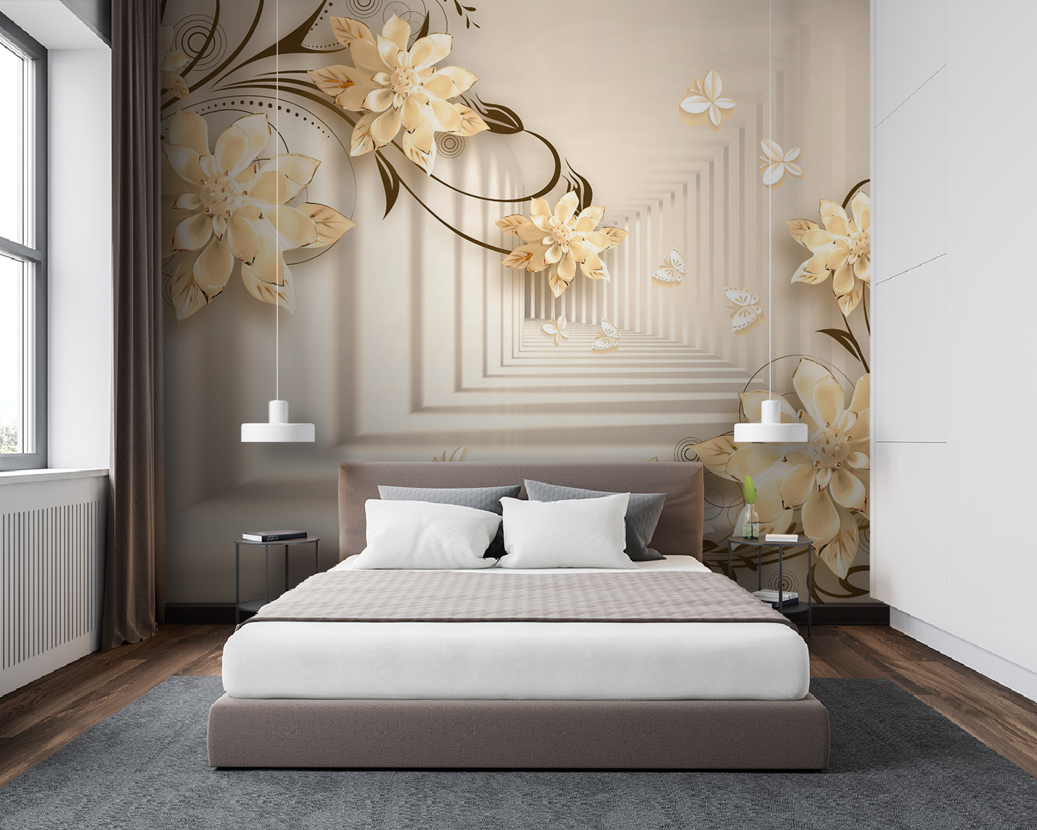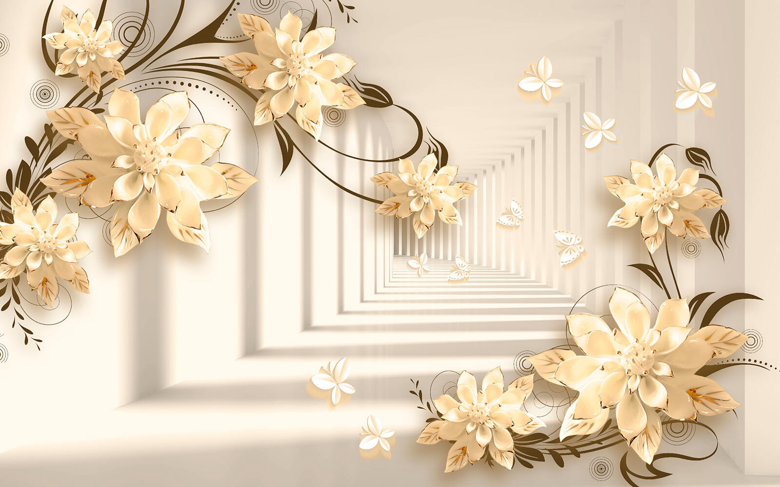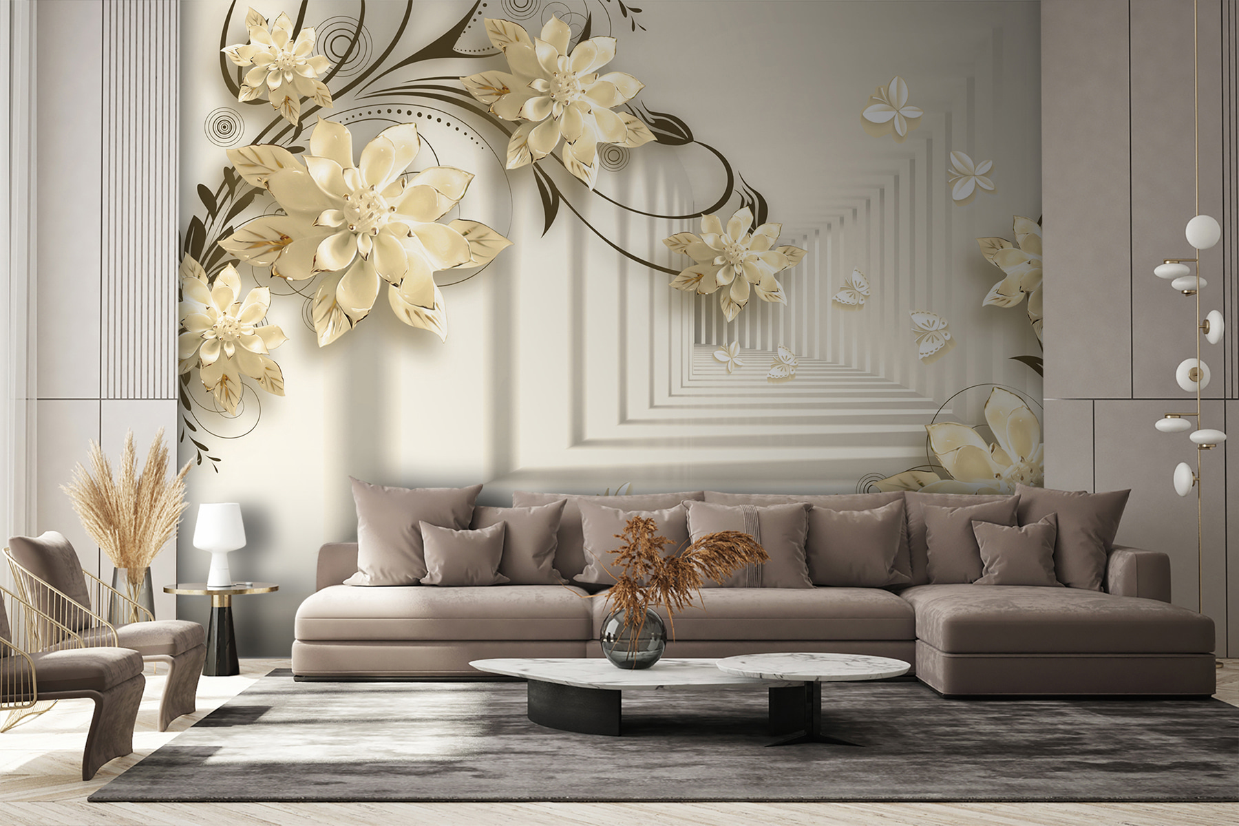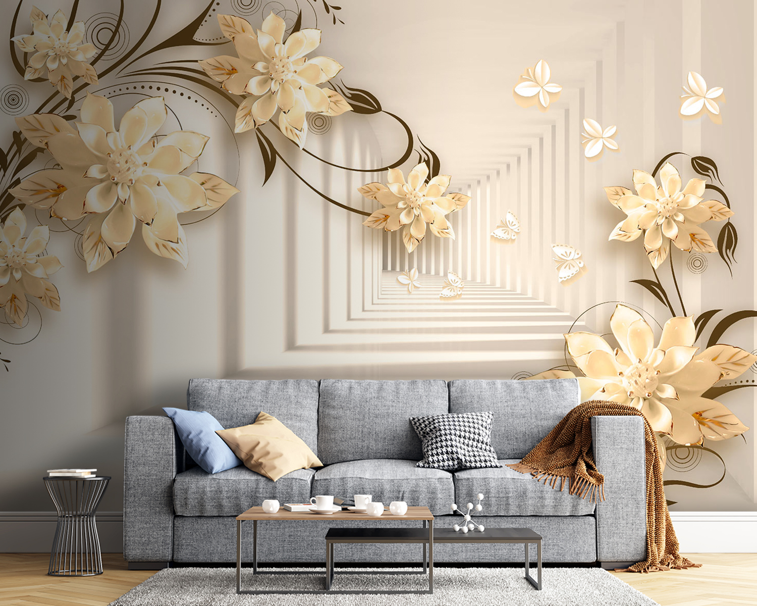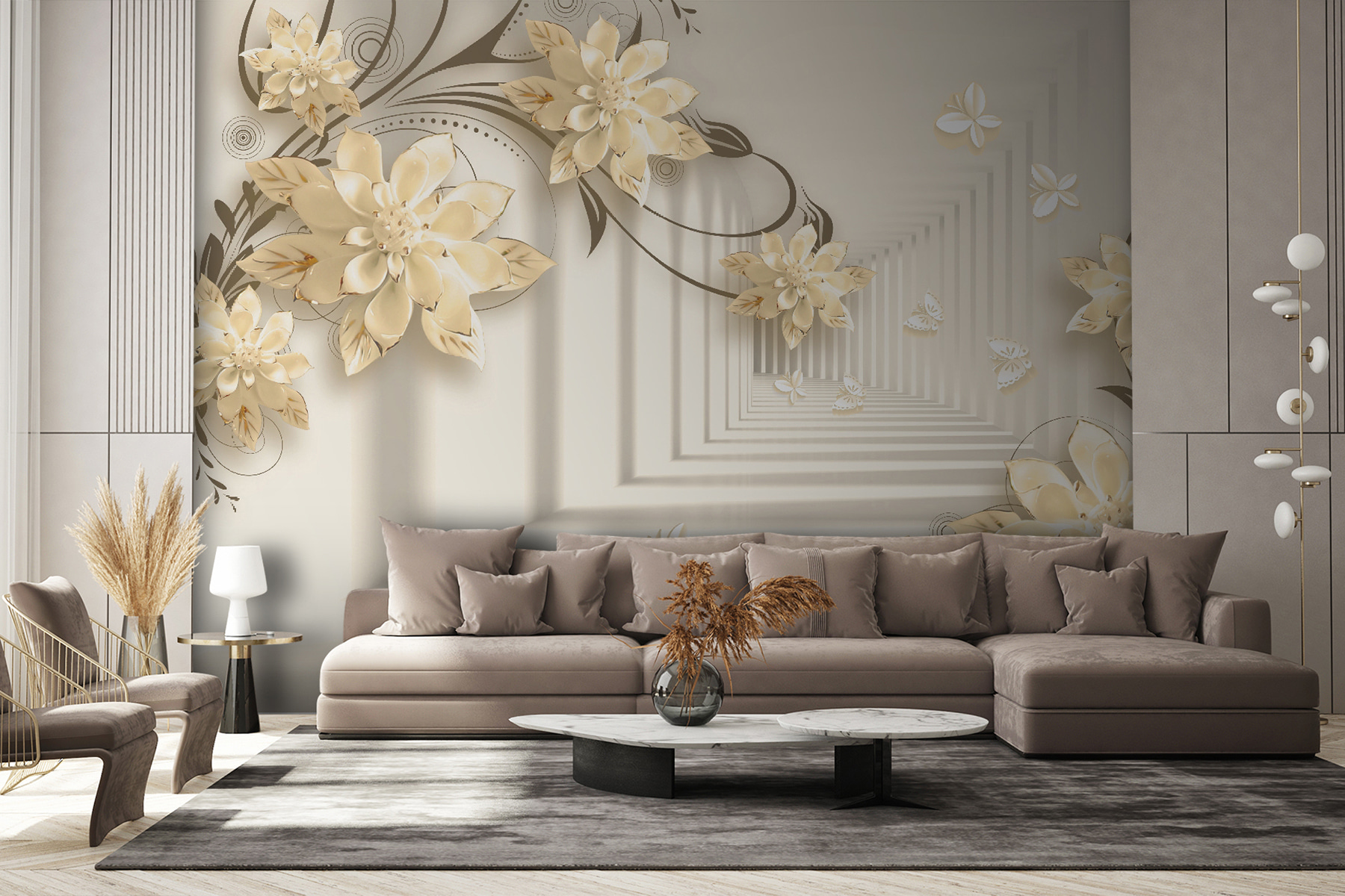 Imagine ter uma parede que parece um jardim caprichoso – mesmo na sua sala de estar! Este mural “Elegant Floral Design with Butterflies” faz exatamente isso. É como entrar numa fantasia serena onde as flores florescem sem parar e as borboletas esvoaçam. Imagine estas flores 3D elegantes a aparecerem, criando uma vibração suave e sonhadora… É como ter a arte da natureza mesmo dentro de casa!