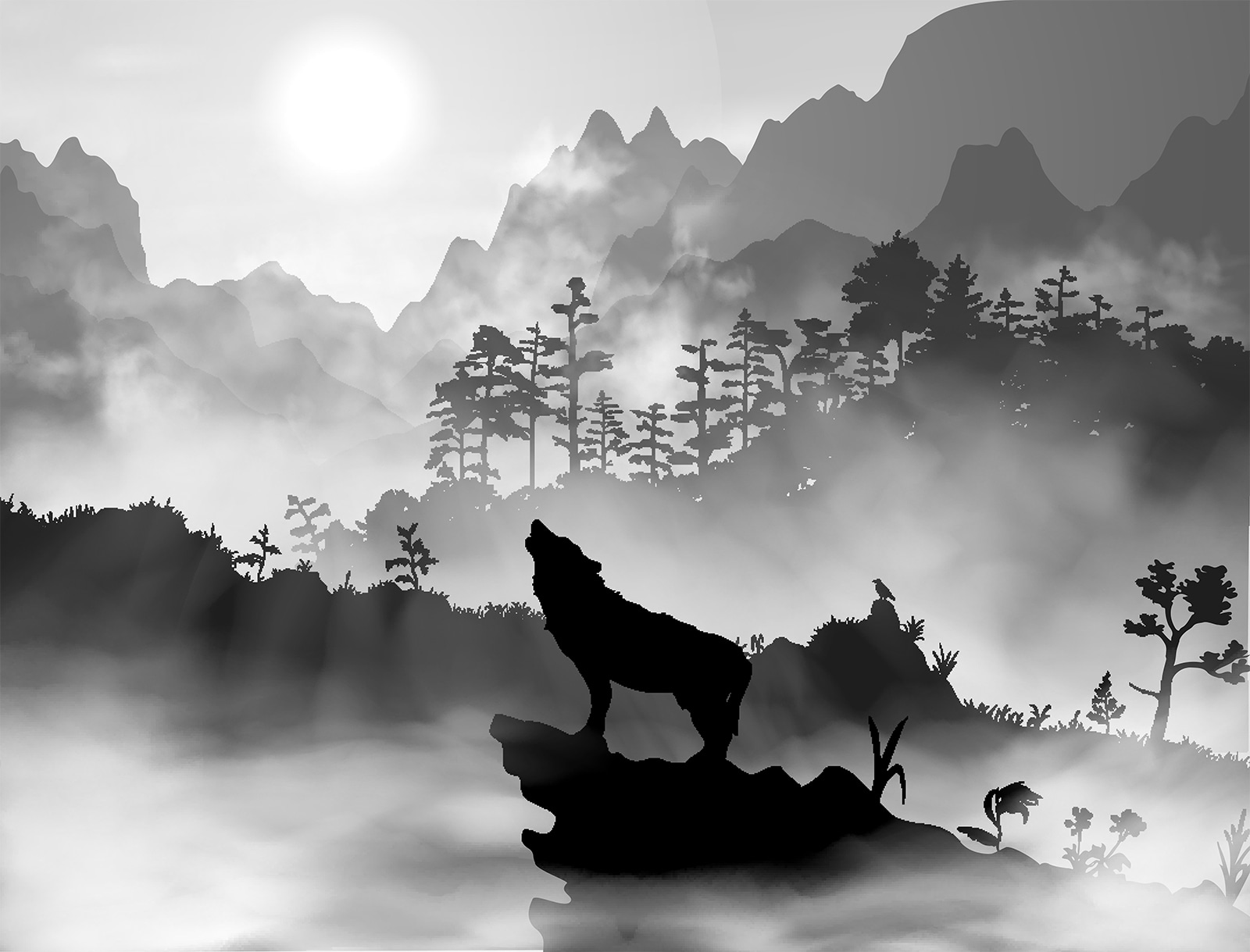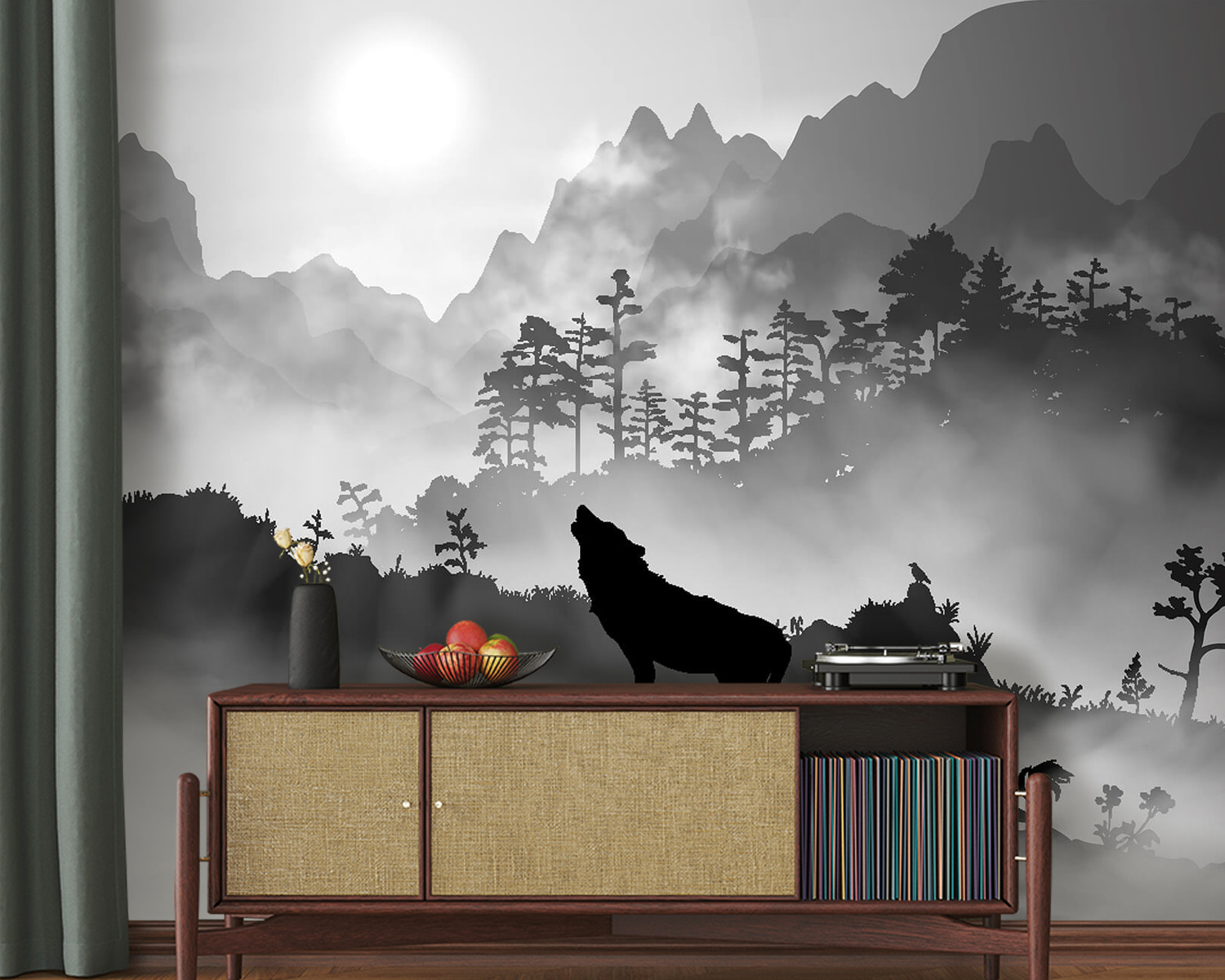 Imagine entrar numa sala acolhedora onde um mural impressionante de um lobo a uivar para a lua ocupa o centro das atenções. Não se trata de um mural qualquer; é como se fosse poesia da natureza na sua parede. As montanhas suaves e enevoadas e as silhuetas das árvores criam um cenário sereno, levando os pensamentos errantes a uma mente tranquila.