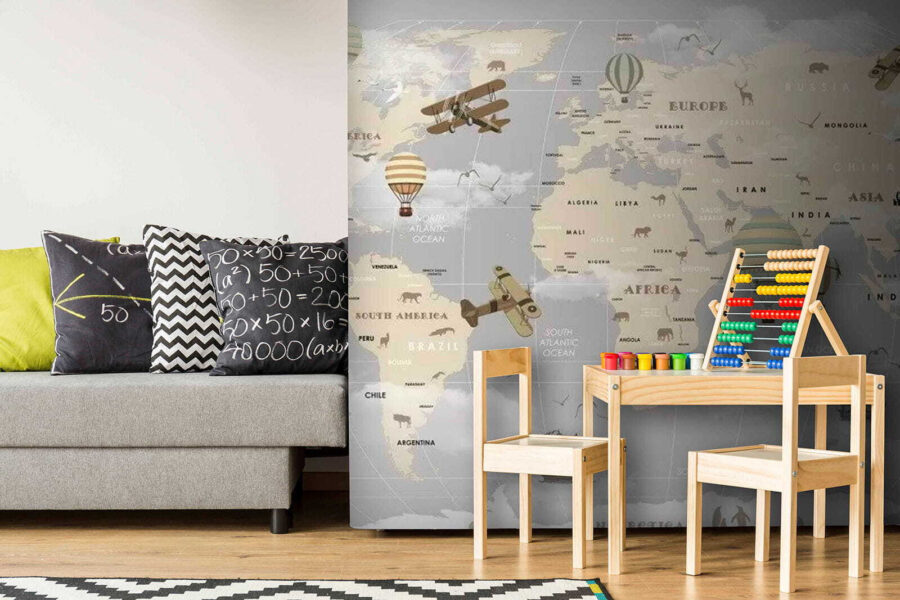 Transforme qualquer divisão numa viagem fantástica com o mural “Mapa do Mundo com Aviões e Balões de Ar Quente”. Imagine entrar num espaço que desperta a vontade de viajar com tons subtis e sonhadores e designs divertidos a dançar sobre os continentes. Cada balão e avião acrescenta um toque de aventura — quem não gostaria de sonhar acordado com viagens pelo mundo enquanto saboreia um café?