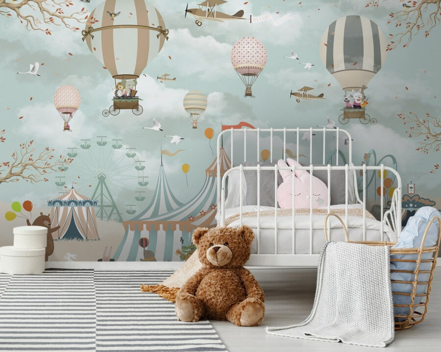 Imagine entrar num espaço que parece uma aventura extravagante. Este mural, com balões de ar quente encantadores e pássaros divertidos, cria um céu encantador onde a imaginação voa. Cada personagem traz um pouco de alegria, despertando histórias e devaneios – quer se trate de um elefante corajoso ou de um urso elegante com balões. Perfeito para o quarto de uma criança ou para qualquer local que precise de uma pitada de diversão, evoca memórias de infância de viagens ao circo e dias de sol passados ao ar livre. Transforme a parede e deixe a magia voar – quem não gostaria de adormecer sob este céu encantador?