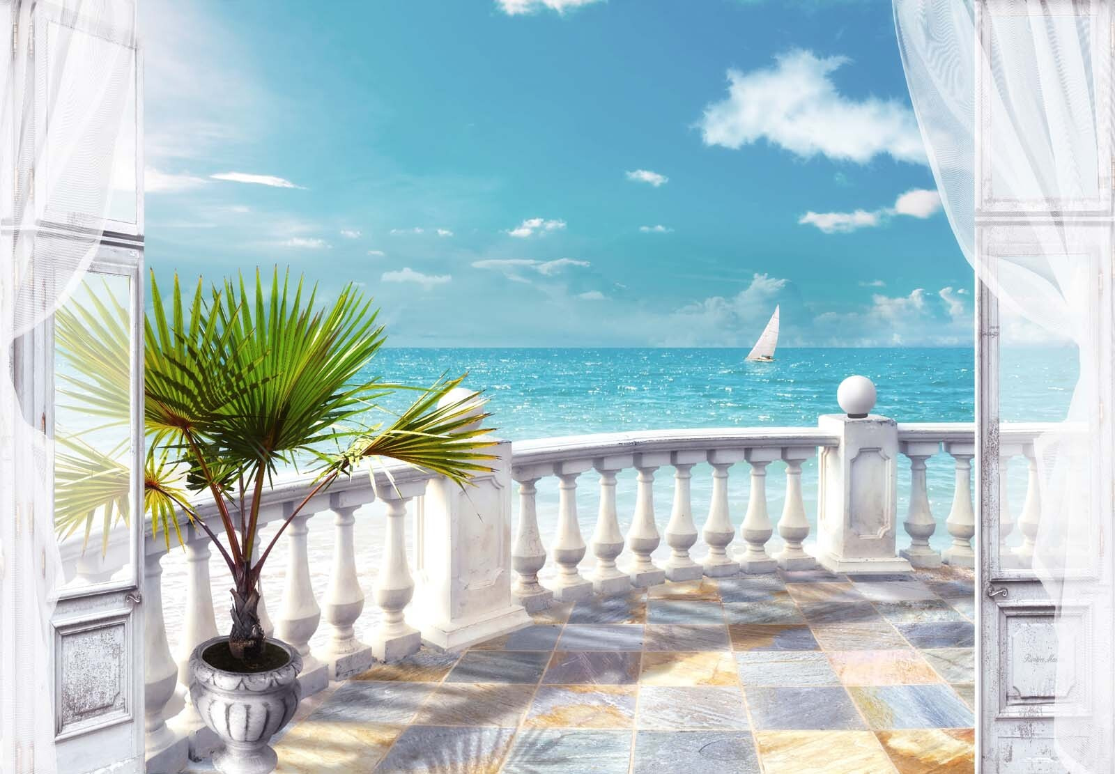 Imagine acordar com uma vista serena para o mar todas as manhãs – é como se fosse uma fuga pessoal mesmo em casa. Este mural de parede, “Palmeira num vaso numa varanda”, traz esse encanto costeiro descontraído para qualquer divisão. Uma brisa parece passar pela porta aberta, agitando as folhas da palmeira. O barco à vela distante, sob nuvens brancas e fofas, acrescenta um ambiente calmo. Perfeito para sonhar acordado… Já sente o sol no seu rosto? Quer seja num escritório em casa, na sala de estar ou mesmo num recanto de leitura acolhedor, este mural convida à paz e a uma sensação de férias sem fim. Combine-o com roupa de cama macia ou decoração de conchas para uma sensação de casa de praia arejada – tudo isto sem a areia nos sapatos!