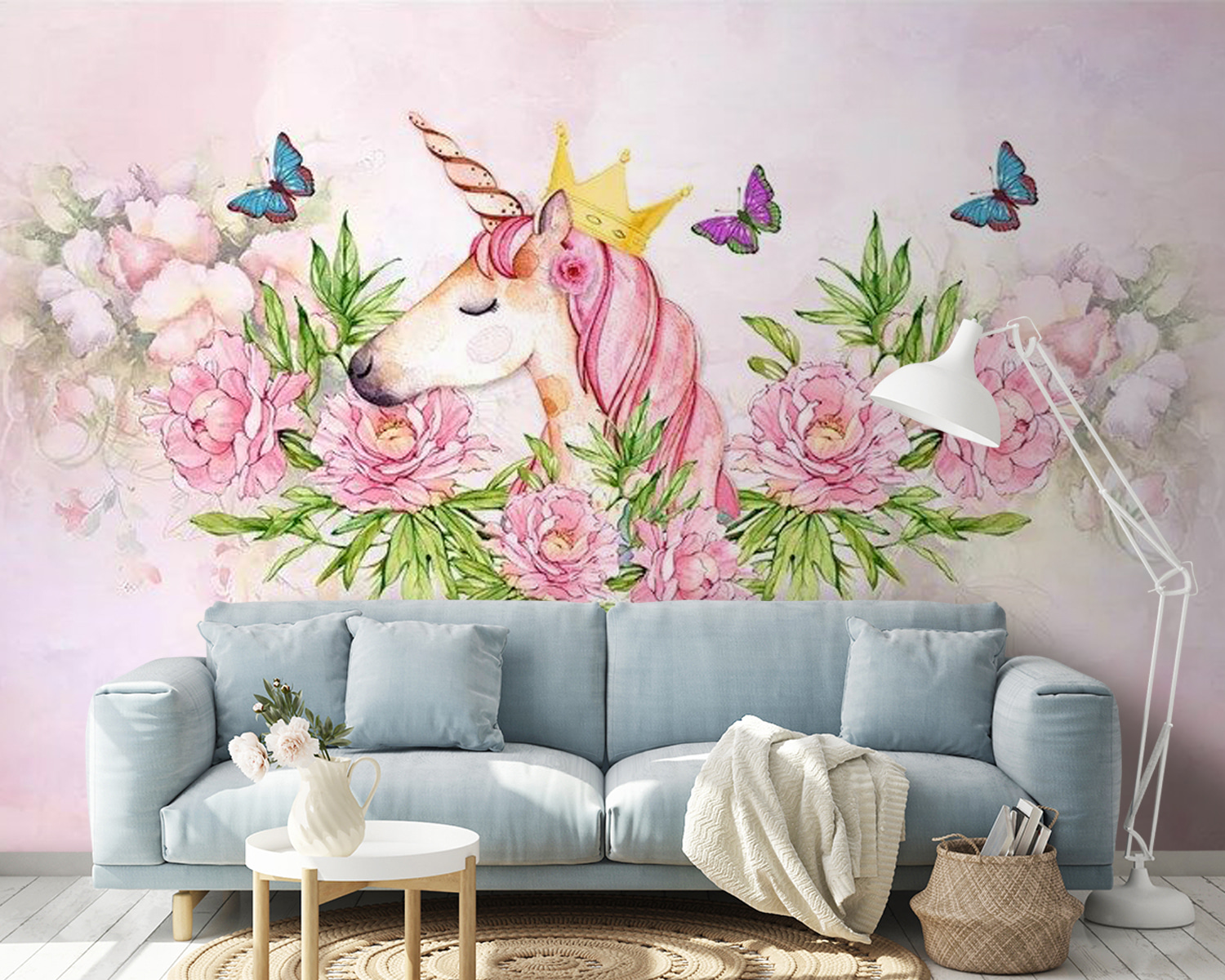 Transforme o espaço de uma criança num reino mágico com este mural de parede encantador que apresenta um unicórnio coroado e rodeado de borboletas. Imagine o encanto nos olhos da sua filha quando ela entra no quarto e é recebida por esta cena extravagante. É como ter um conto de fadas a ganhar vida diretamente nas paredes! As cores suaves e o design encantador criam uma atmosfera serena mas vibrante. Imagine momentos aconchegantes de histórias ou brincadeiras onde a imaginação pode voar – não há necessidade de sapatos brilhantes quando este mural traz toda a magia! Perfeito para qualquer pequeno sonhador.