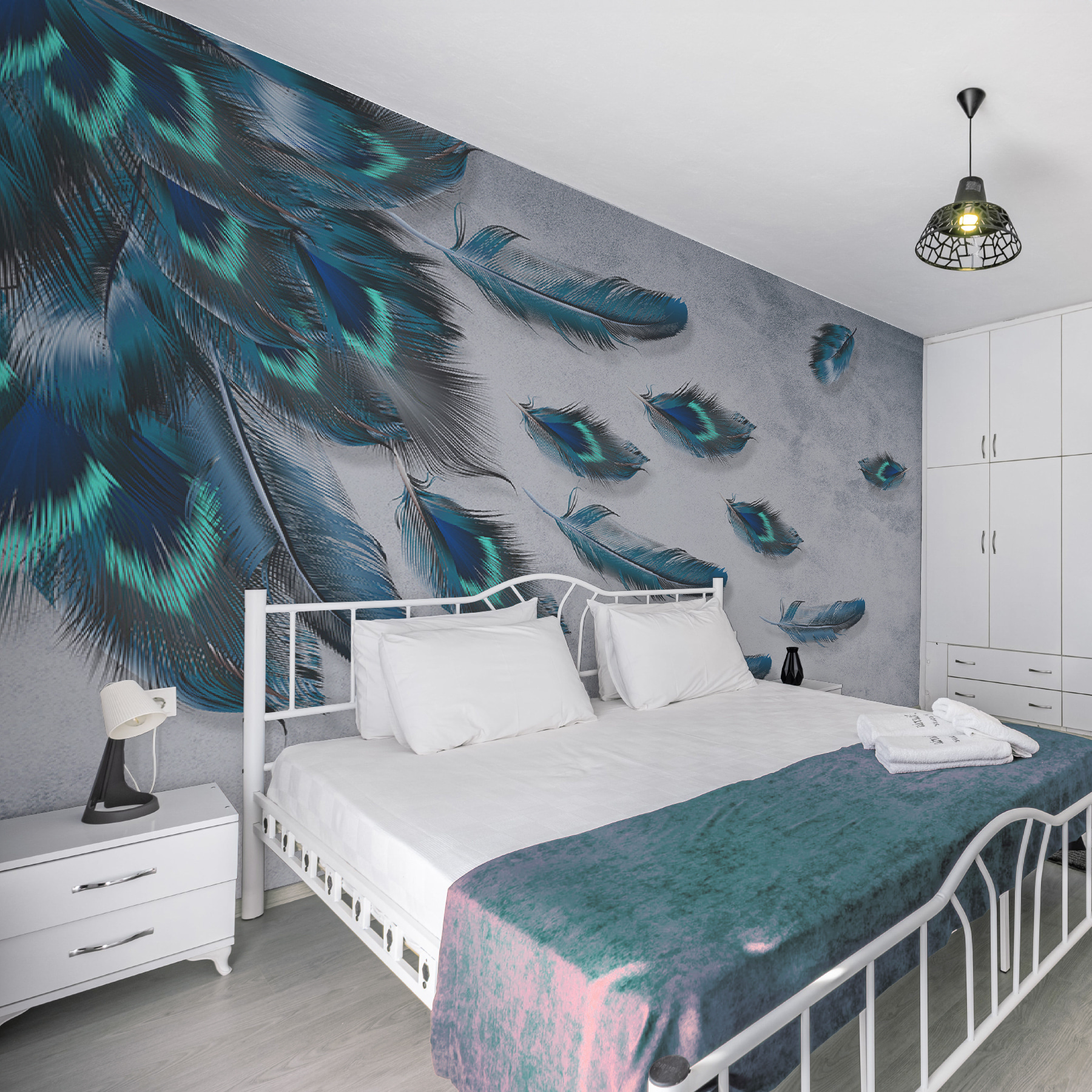 Transforme qualquer divisão com os encantadores murais de parede Blue Feathers. Imagine acordar com uma suave cascata de penas deslumbrantes que parecem dançar nas suas paredes. Os azuis serenos e os verdes vivos criam uma atmosfera calmante, perfeita para relaxar após um longo dia. Imagine noites aconchegantes com um livro, com a suavidade do design a envolvê-lo em tranquilidade. É como uma lufada de ar fresco em qualquer espaço. Os amigos vão certamente reparar neste toque único e, quem sabe, pode ser que desperte uma conversa cheia de penas! Perfeito para quem procura dar um toque de personalidade à sua decoração.