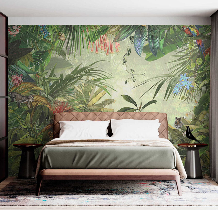 Sempre quis que o seu espaço de vida se sentisse como uma aventura exótica? Este mural de parede “Lush Jungle” pode ser o ideal. Imagine acordar, pegar no seu café e olhar diretamente para uma vibrante floresta tropical cheia de vida – papagaios, macacos, tigres… Quase pode ouvir o farfalhar das folhas ou sentir uma brisa fresca da selva! As cores são maravilhosamente profundas – verdes luxuriantes, tons de terra ricos, flores em destaque. Perfeito para os amantes da natureza ou para qualquer pessoa que deseje um toque de natureza selvagem em casa. É como uma pequena fuga, mesmo na sua parede!