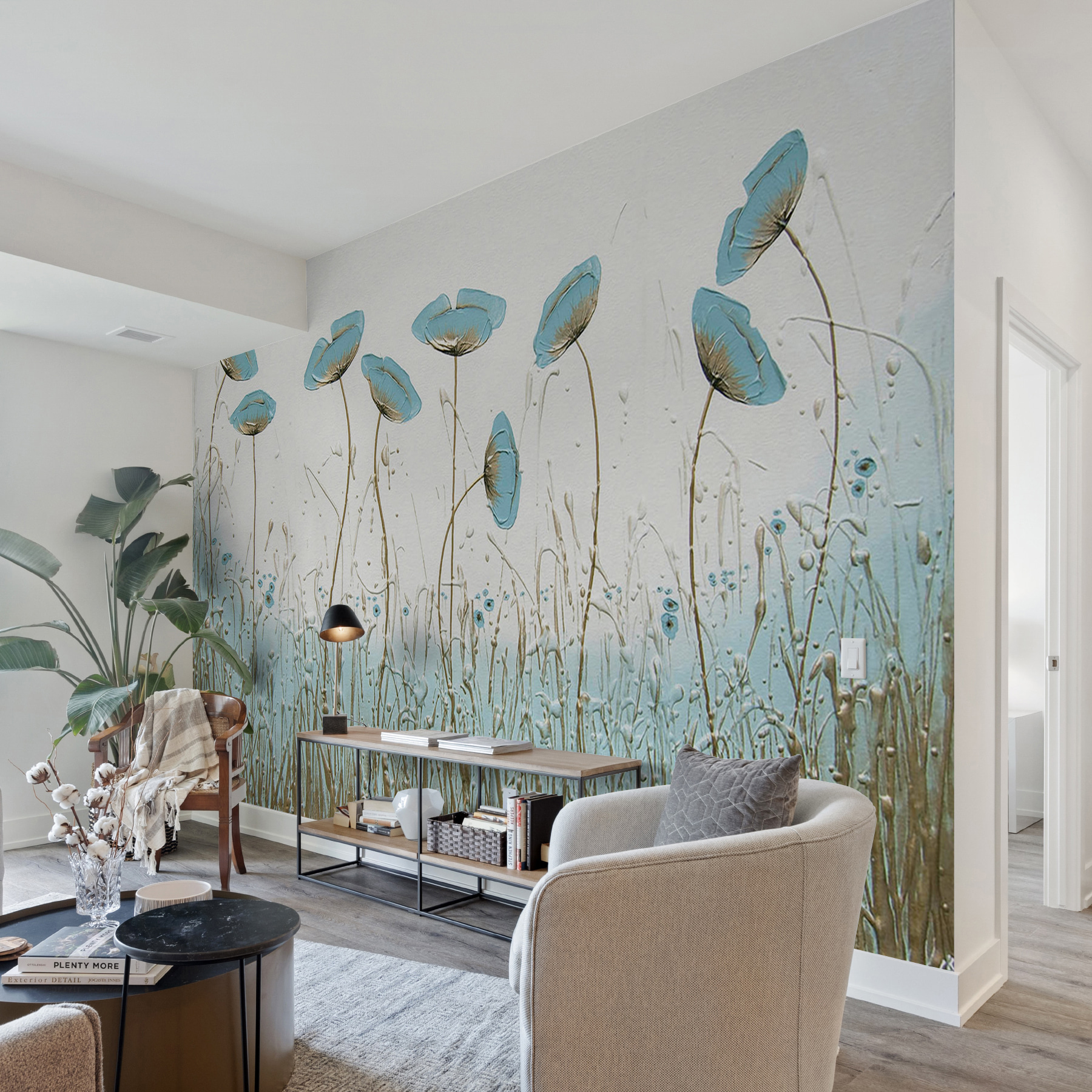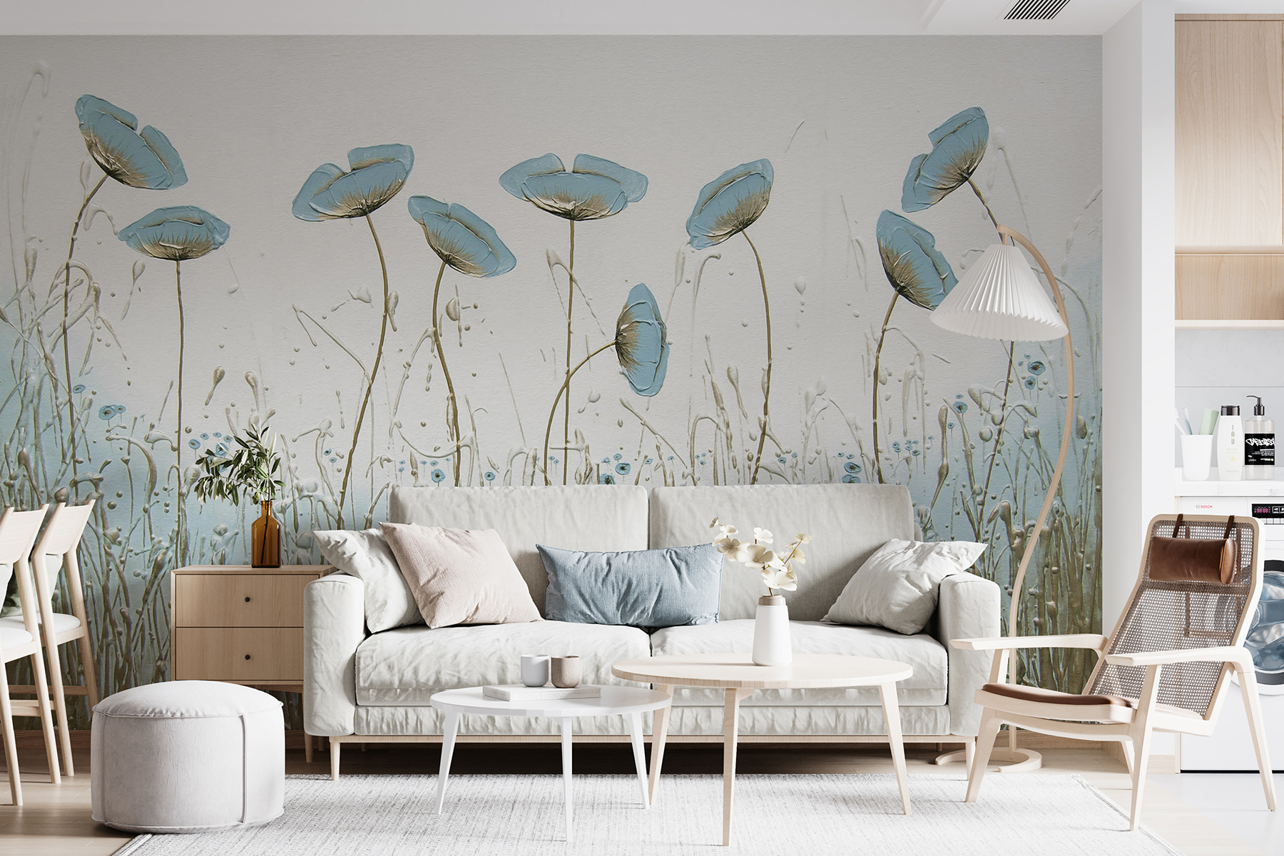 Sempre quis trazer um toque de natureza para dentro de casa? Este mural deslumbrante pode ser a sua resposta. Imagine: delicadas flores azuis a balançar suavemente, como se pudessem sentir uma brisa suave a passar por elas. Instantaneamente calmante, certo?