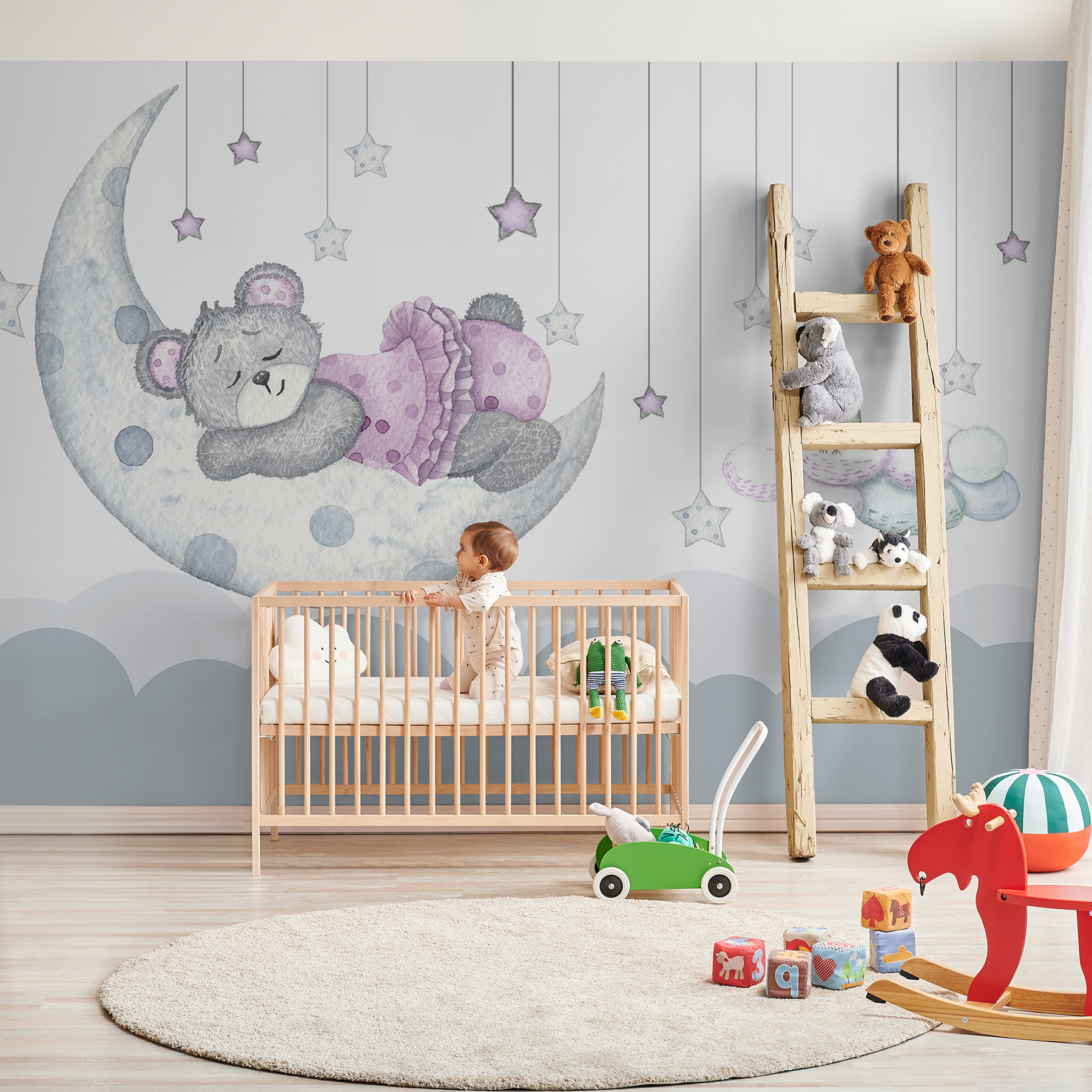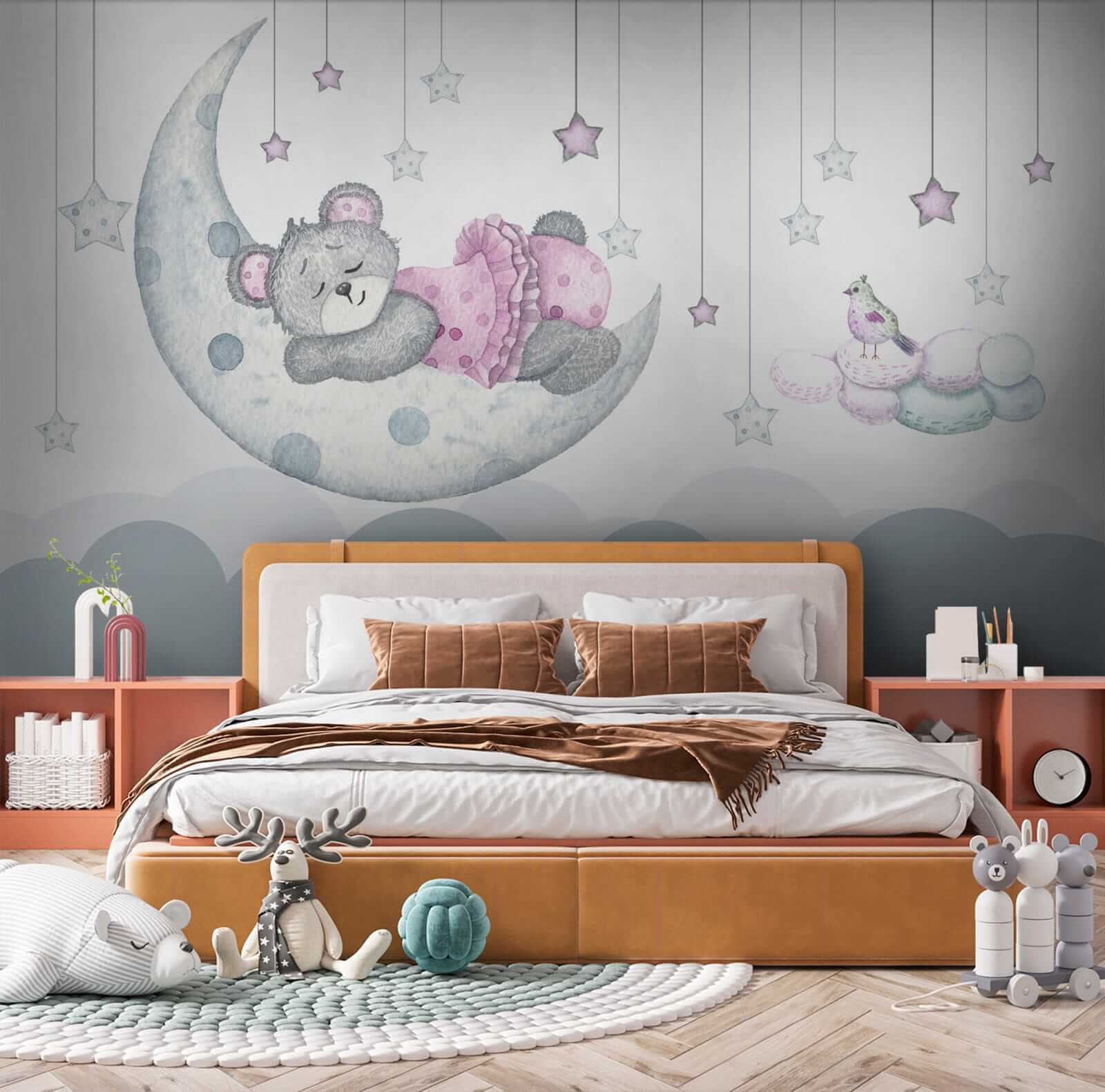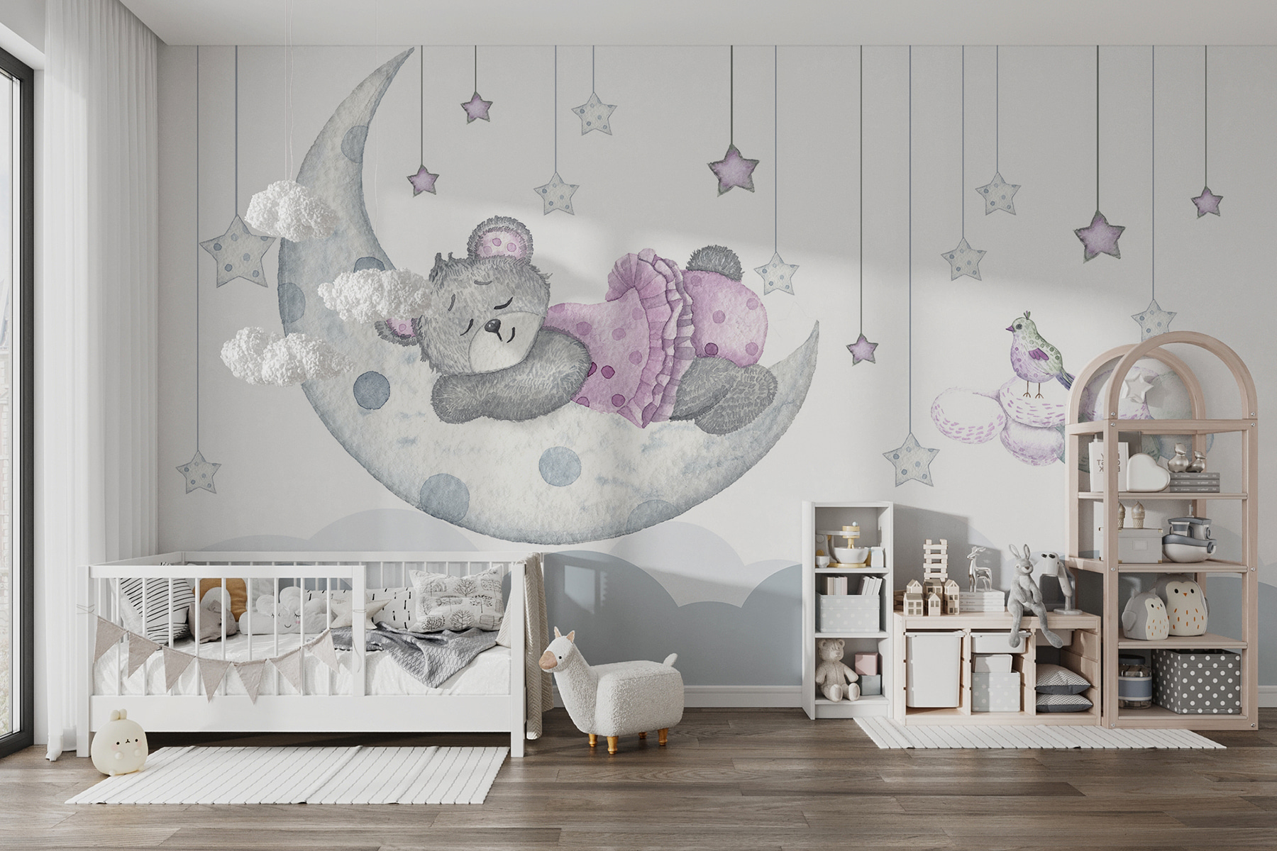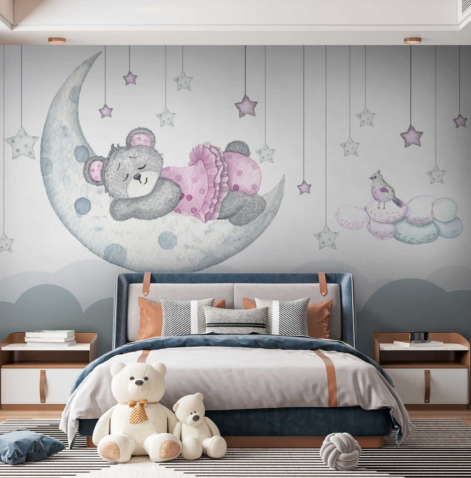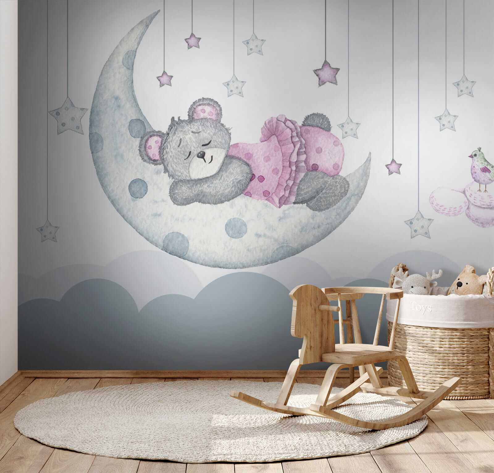 Imagine um ursinho de peluche com um vestido cor-de-rosa, a dormir tranquilamente na lua – parece um sonho, não é? Este mural de aguarela é perfeito para dar um toque de magia ao quarto de qualquer criança. É suave e caprichoso, com cores pastel suaves que criam uma atmosfera calmante… perfeita para histórias de embalar e sonhos doces! Imagine a cara do seu filho quando vir o seu novo melhor amigo na parede. Além disso, é um ótimo pano de fundo para fotografias divertidas. Ah, vibrações acolhedoras e faíscas criativas – este mural traz ambas!