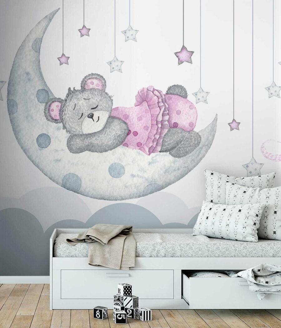 Imagine um ursinho de peluche com um vestido cor-de-rosa, a dormir tranquilamente na lua – parece um sonho, não é? Este mural de aguarela é perfeito para dar um toque de magia ao quarto de qualquer criança. É suave e caprichoso, com cores pastel suaves que criam uma atmosfera calmante… perfeita para histórias de embalar e sonhos doces! Imagine a cara do seu filho quando vir o seu novo melhor amigo na parede. Além disso, é um ótimo pano de fundo para fotografias divertidas. Ah, vibrações acolhedoras e faíscas criativas – este mural traz ambas!