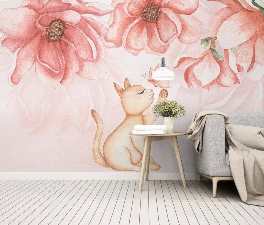 Transforme o seu espaço com este encantador mural de parede que apresenta um gato caprichoso a brincar com uma borboleta. O estilo suave da aguarela e as delicadas flores cor-de-rosa criam uma atmosfera de sonho que nos faz sentir como se estivéssemos a passear por um jardim ensolarado. Você não consegue imaginar tardes sonhadoras passadas com uma xícara de chá ou talvez uma festa dançante improvisada? Este mural traz charme e um toque de magia a qualquer ambiente. Seja para um canto aconchegante ou um quarto infantil caprichoso, ele certamente evocará sorrisos e calor humano. Quem não gostaria de se sentir como se estivesse em um livro de contos?