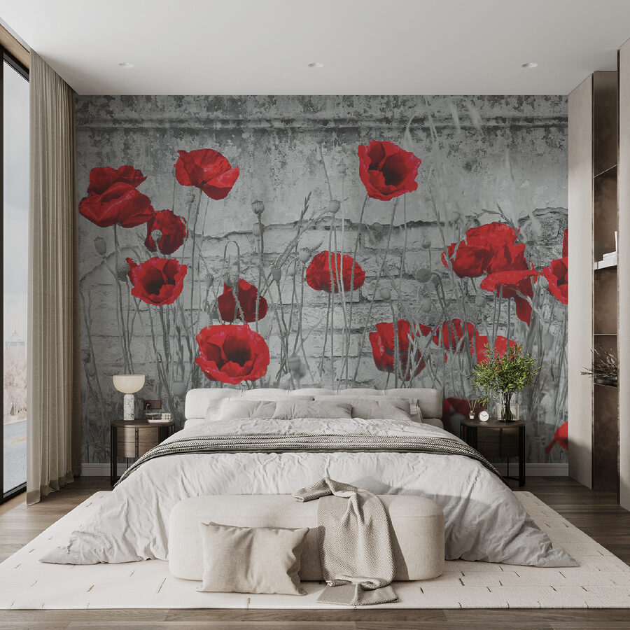 Imagine entrar numa sala e ser imediatamente saudado por um salpico de papoilas vermelhas vivas contra uma parede rústica e desgastada pelo tempo. Este mural é como um belo jardim secreto em que se tropeça no meio da cidade. É tudo uma questão de contraste – flores ardentes contra um pano de fundo rugoso, criando uma vibração que é ao mesmo tempo acolhedora e ousada. Pense nisso: cada olhar para estas pétalas vibrantes pode animar o ambiente, especialmente num dia de chuva. Ideal para quem adora um toque de natureza e uma pitada de drama na sua decoração. Além disso, quem não gostaria de se sentir um pouco artístico sempre que passa por ele? E é muito menos manutenção do que um jardim a sério!