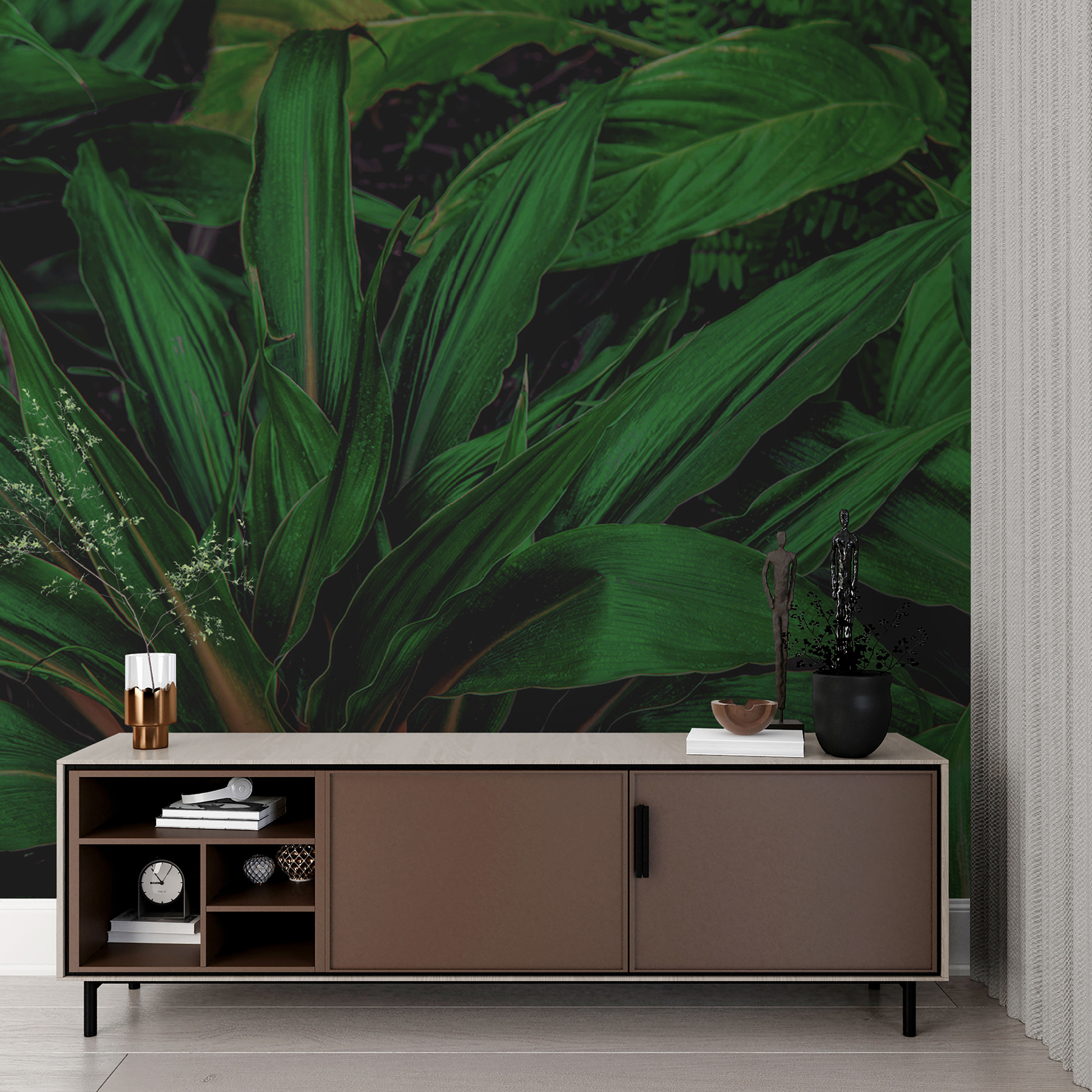 Não é apenas papel de parede, é uma afirmação. Ao entrar numa sala adornada com este mural, é recebido com uma sensação de calma e aventura – como umas mini-férias todos os dias. Quer seja na sua sala de estar, no escritório ou até na casa de banho, este design transforma os espaços em escapadelas verdejantes. As folhas em camadas adicionam profundidade e textura, criando um efeito 3D que é quase tangível. Provavelmente, vai dar por si a estender a mão para tocar nessas folhas mais do que uma vez!