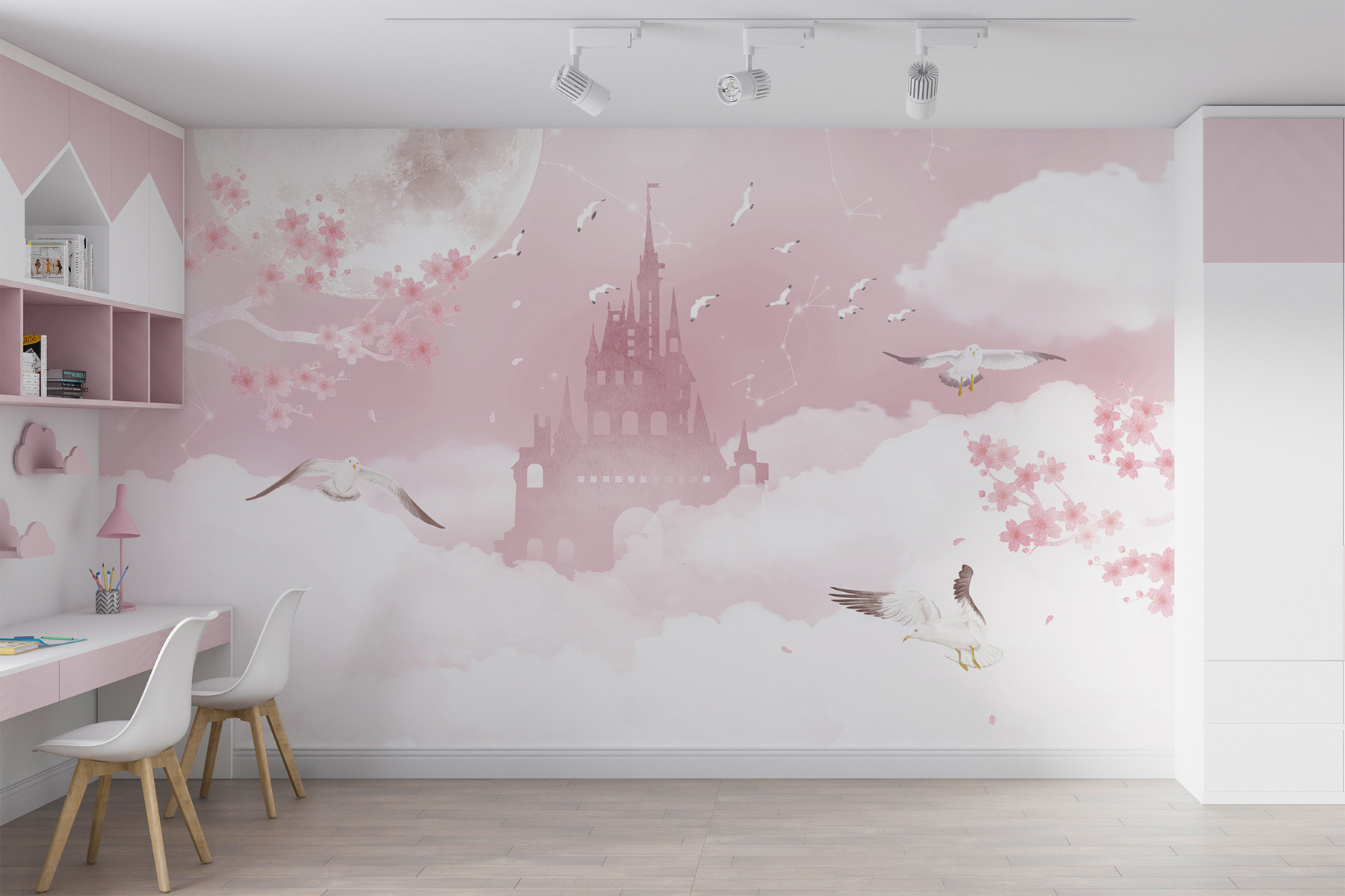 Imagine uma menina deitada na cama, a olhar para este mural e a viajar para um mundo onde pode voar com pássaros ou explorar castelos escondidos. As cores tranquilas e os elementos encantadores criam um espaço tão calmo e imaginativo. Não é apenas um mural – é uma aventura que começa sempre que ela entra no seu quarto!