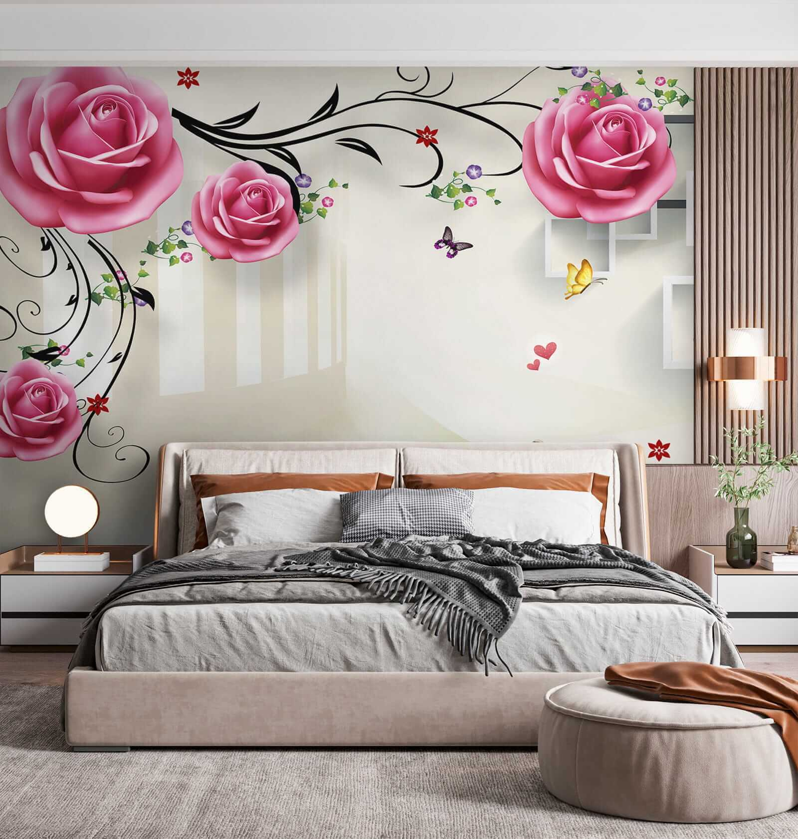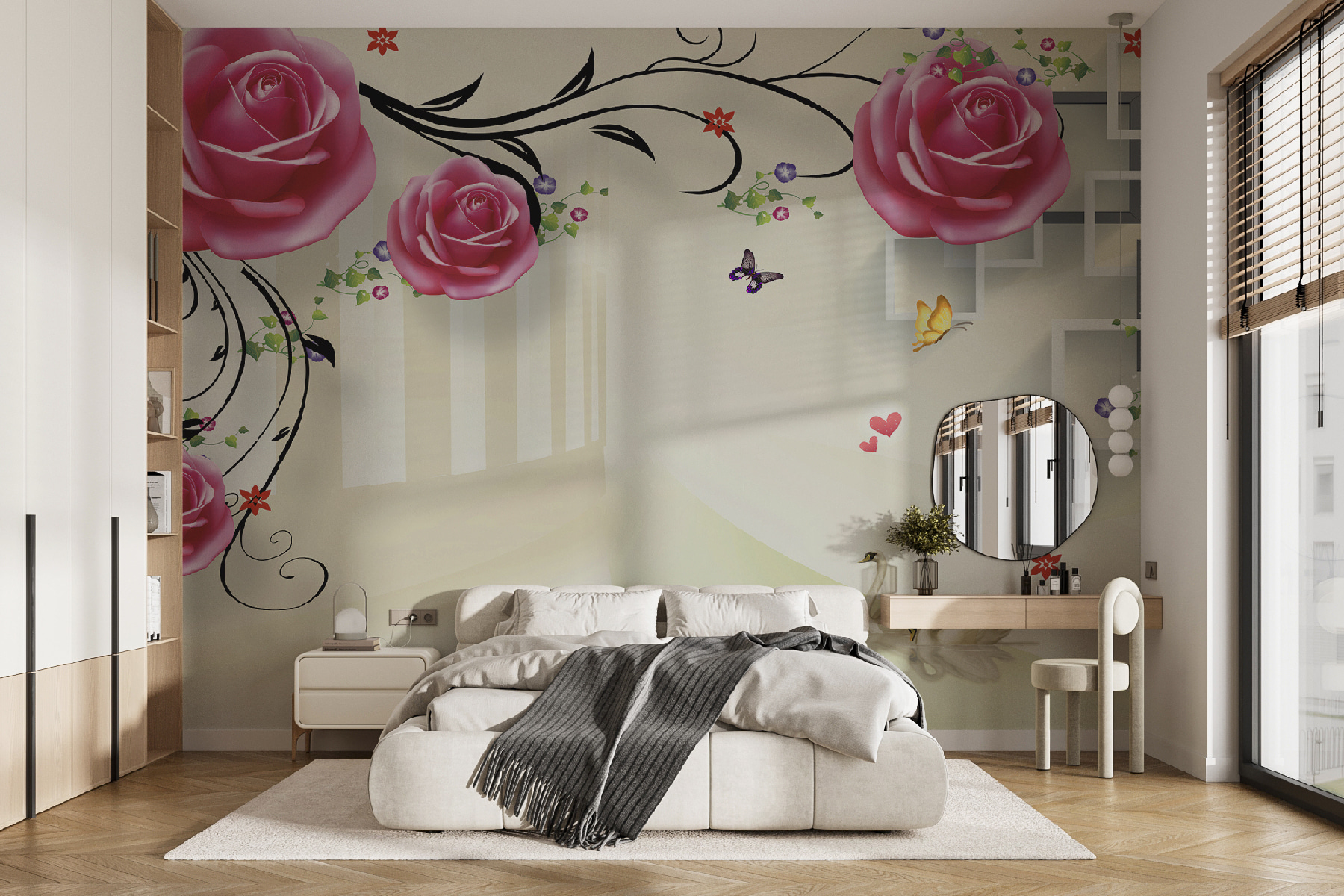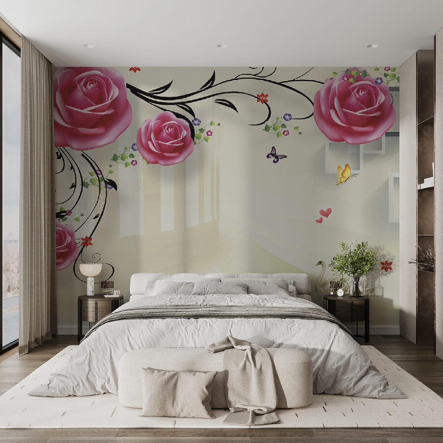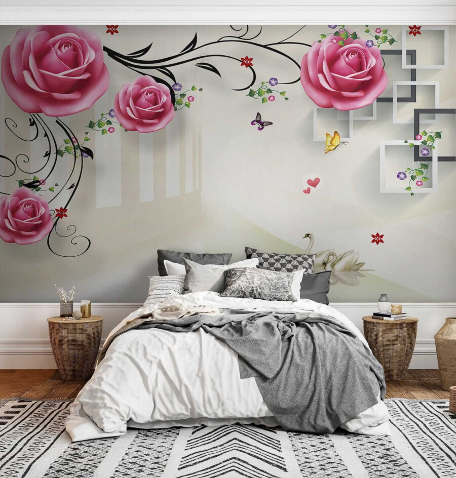 Imagine acordar com este mural hipnotizante todos os dias – é como entrar num jardim de sonho! Cisnes a deslizar graciosamente por baixo de rosas cor-de-rosa em flor, com borboletas a esvoaçar, dão ao seu espaço um toque de magia serena. Perfeito para quem procura trazer um pouco da natureza para dentro de casa com um toque de elegância. E aquelas rosas – quase parece que lhes pode tocar!