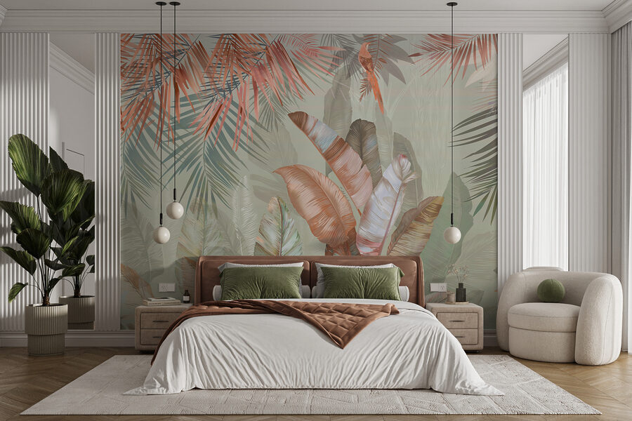 Transforme o seu espaço com este mural encantador que apresenta folhas tropicais em tons pastel suaves. Imagine isto: acordar numa sala iluminada pelo sol onde a natureza sussurra através da arte. Estes verdes suaves e tons de blush convidam a uma vibração calma, perfeita para aquele recanto acolhedor ou mesmo para uma sala de estar luminosa. Imagine tomar um café num dia de chuva e sentir-se como se estivesse a descansar numa selva serena. É como se fossem umas mini-férias mesmo na sua parede. Além disso, é um ótimo início de conversa – os convidados ficarão curiosos sobre a inspiração por detrás desta beleza calmante.