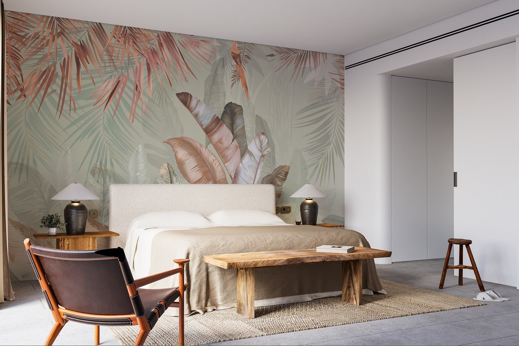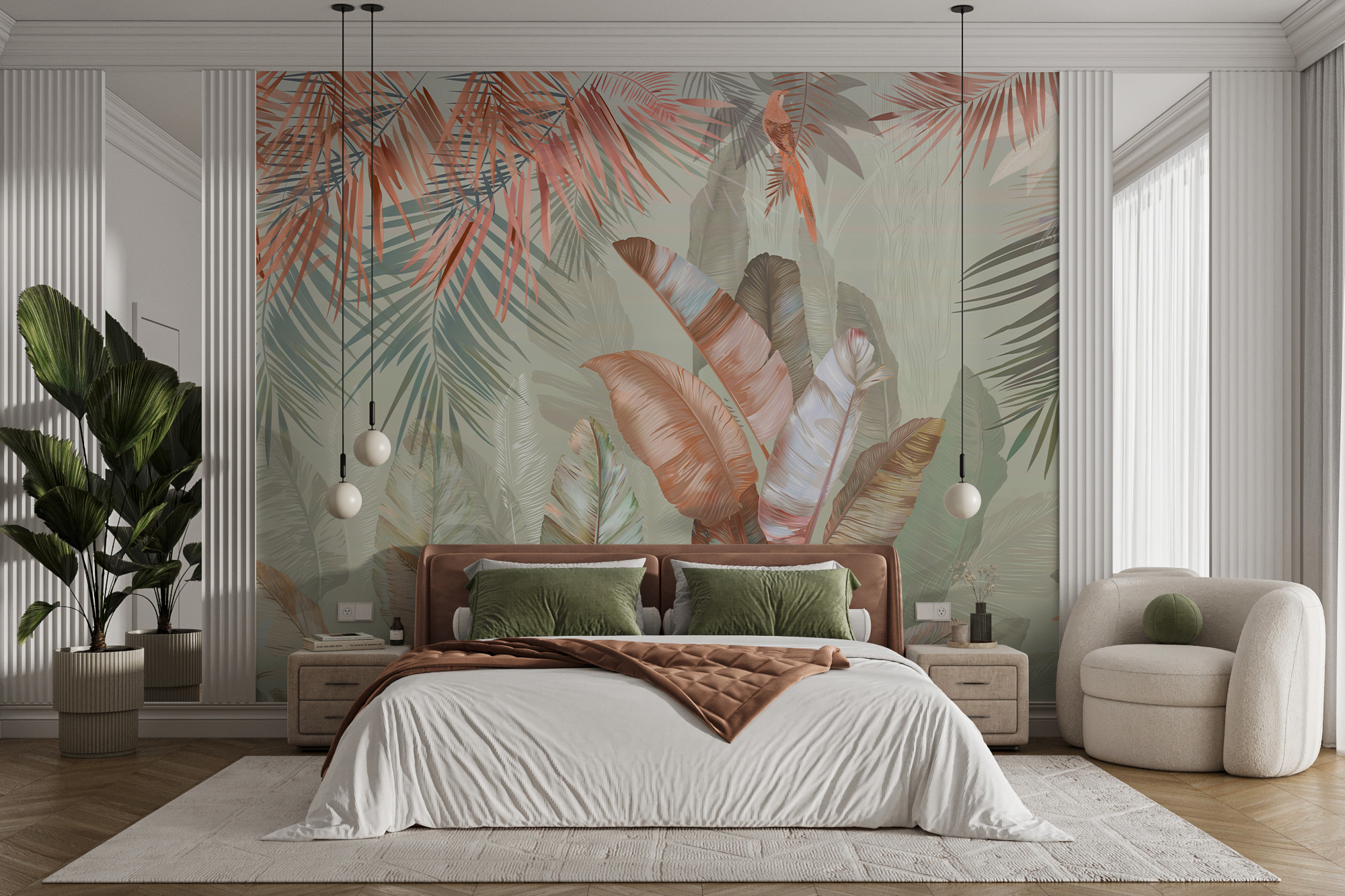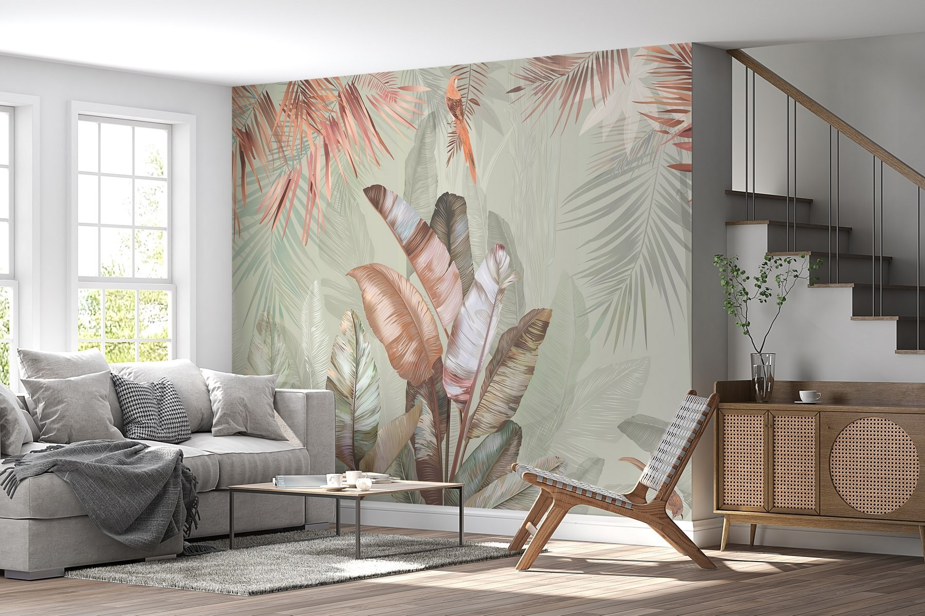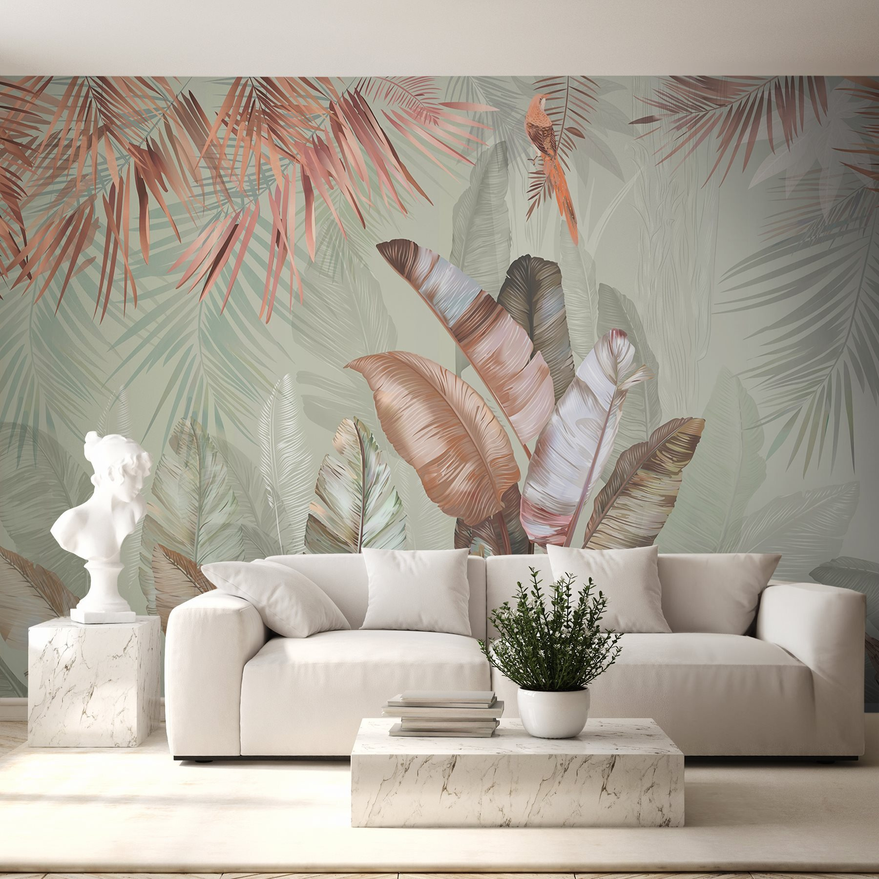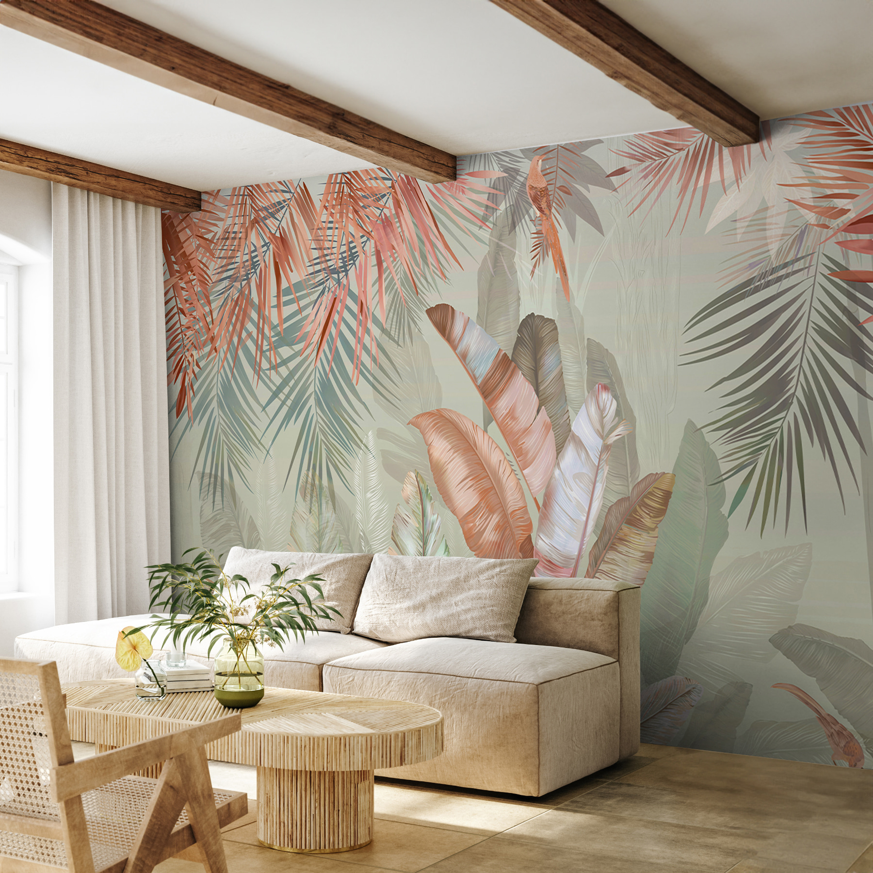 Transforme o seu espaço com este mural encantador que apresenta folhas tropicais em tons pastel suaves. Imagine isto: acordar numa sala iluminada pelo sol onde a natureza sussurra através da arte. Estes verdes suaves e tons de blush convidam a uma vibração calma, perfeita para aquele recanto acolhedor ou mesmo para uma sala de estar luminosa. Imagine tomar um café num dia de chuva e sentir-se como se estivesse a descansar numa selva serena. É como se fossem umas mini-férias mesmo na sua parede. Além disso, é um ótimo início de conversa – os convidados ficarão curiosos sobre a inspiração por detrás desta beleza calmante.