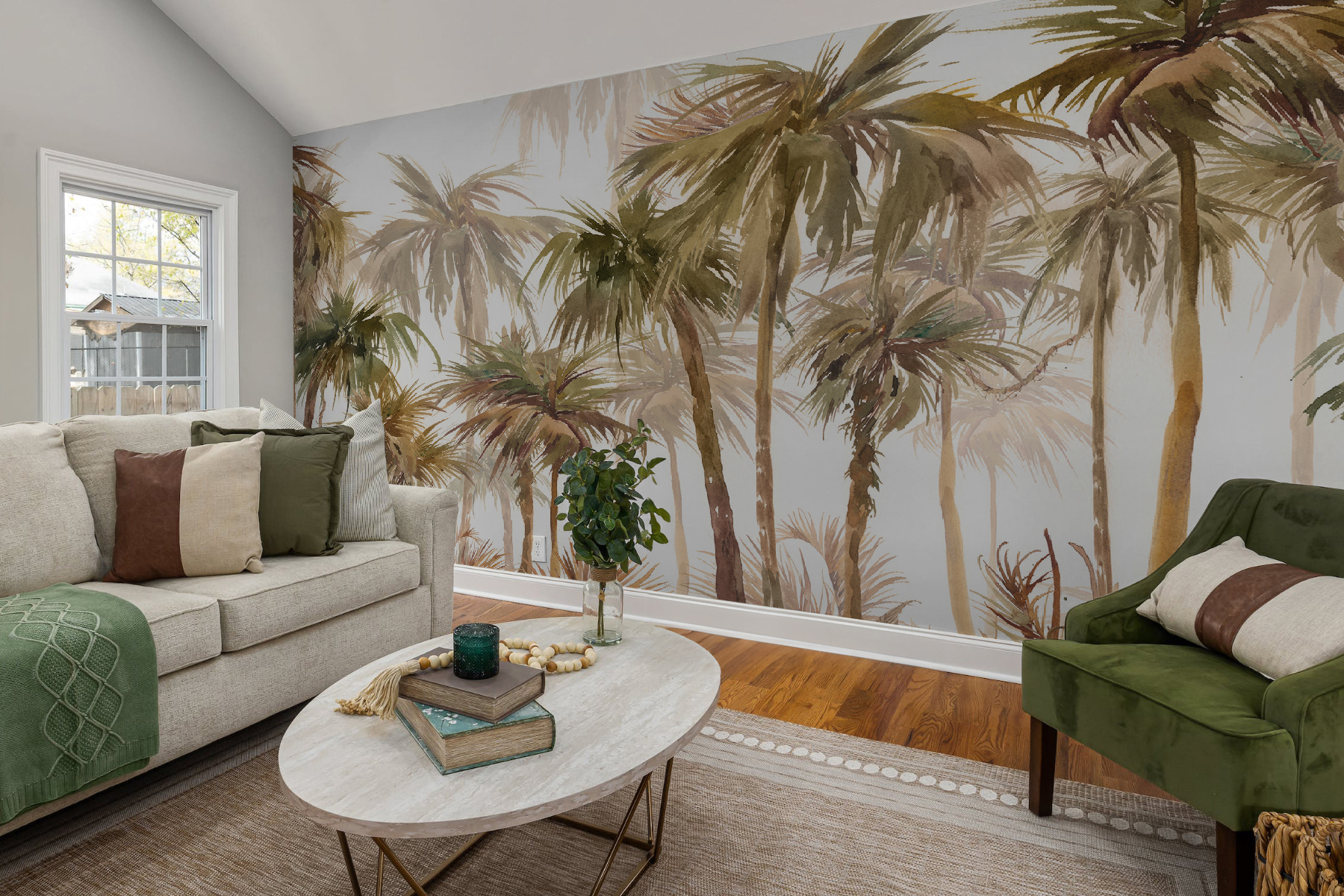 Imagine-se a relaxar no seu próprio oásis tropical sem sequer sair da sua sala de estar! Este mural de aquarela de palmeiras traz uma vibração sonhadora da selva – perfeita para transformar qualquer espaço num pedaço do paraíso. É como ter umas férias instantâneas na sua parede! Os verdes e os castanhos suaves misturam-se lindamente, criando um cenário sereno que sussurra “relaxamento” a cada olhar. Imagine-se com uma bebida fresca, sentindo a brisa do mar imaginária… Sim, é esse tipo de magia. Perfeito para qualquer divisão que precise de um pouco (ou muito) de zen!