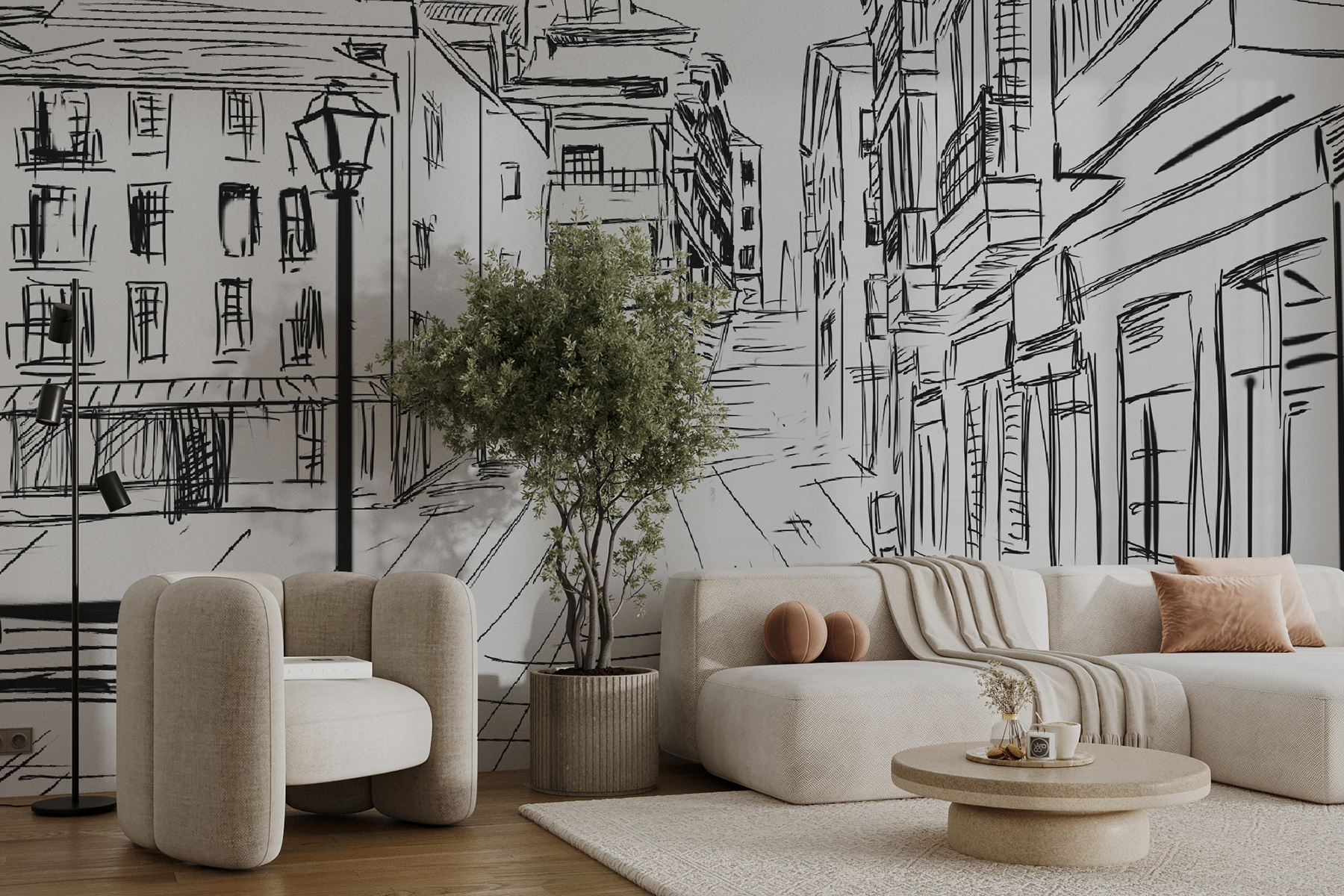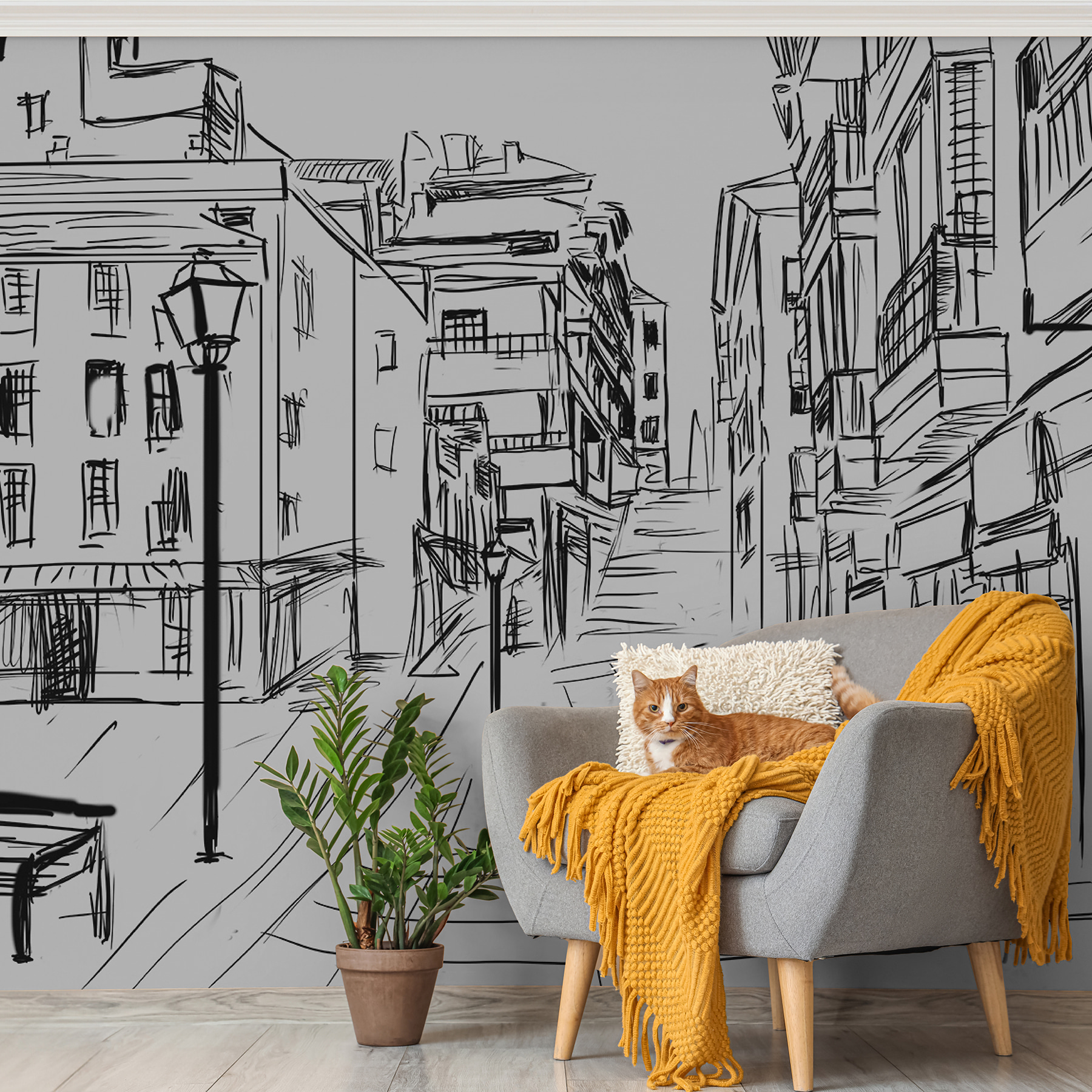 Imagine-se a relaxar na sua sala de estar com este deslumbrante mural a preto e branco na sua parede. É como um esboço caprichoso que ganha vida! As linhas divertidas que capturam uma cena urbana – completa com um banco solitário e edifícios imponentes – trazem um toque artístico que o fará sonhar com as ruas europeias.