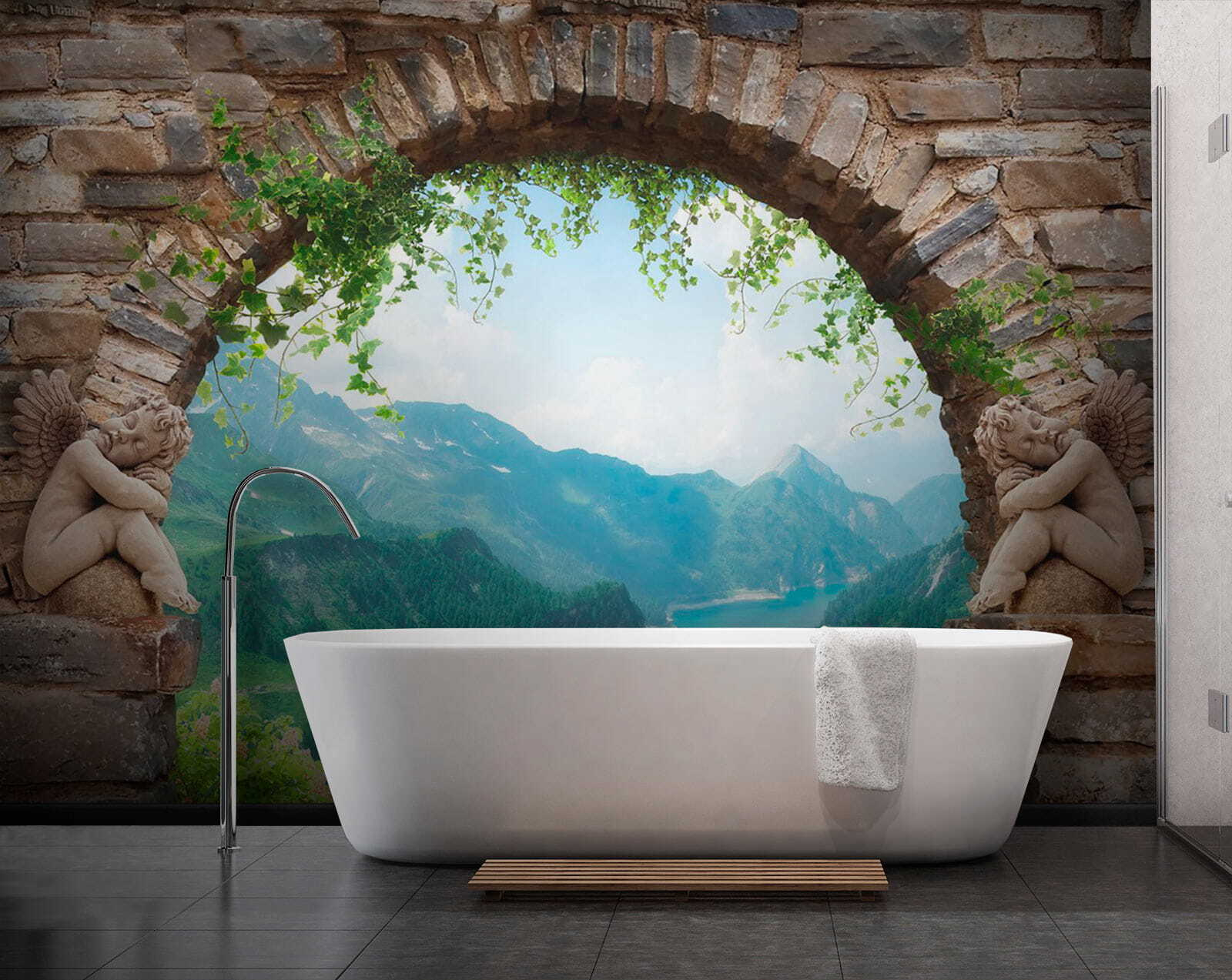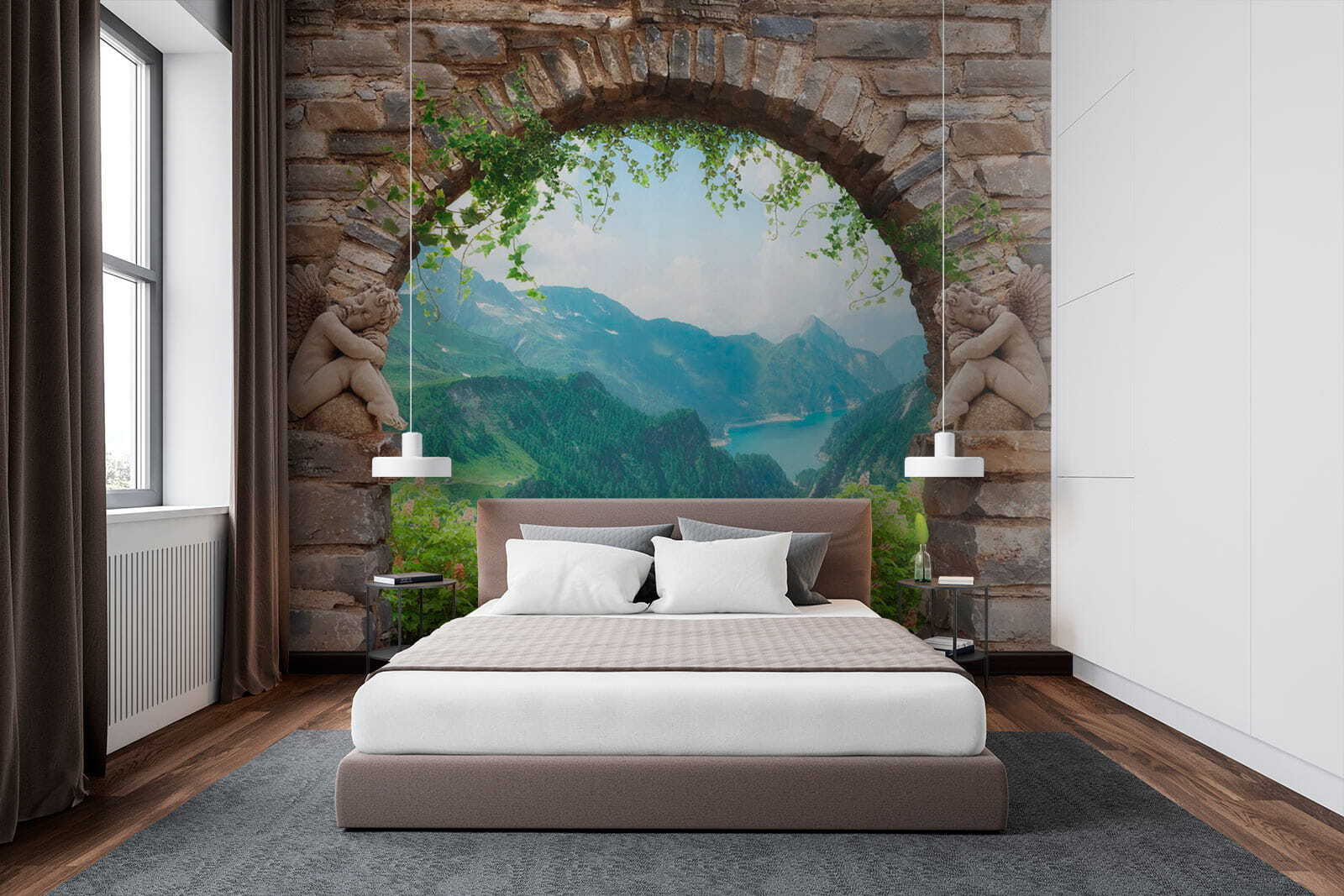 Imagine passar por um arco de pedra rústico que conduz diretamente a uma vista de vale de cortar a respiração. Este mural não é apenas uma decoração; ele dá origem a uma pequena aventura todos os dias. Imagine-se a beber o seu café da manhã enquanto contempla a vegetação luxuriante e a água cintilante lá em baixo. Os querubins brincalhões de cada lado dão um toque de capricho, fazendo com que pareça uma cena de um conto de fadas. Perfeito para uma sala de estar ou um recanto acolhedor, este mural transforma qualquer espaço numa fuga de sonho. É como ter um pequeno pedaço da natureza na sua parede, convidando sem esforço a uma sensação de calma e maravilha na vida quotidiana. Só não se esqueça de regar essas plantas imaginárias!
