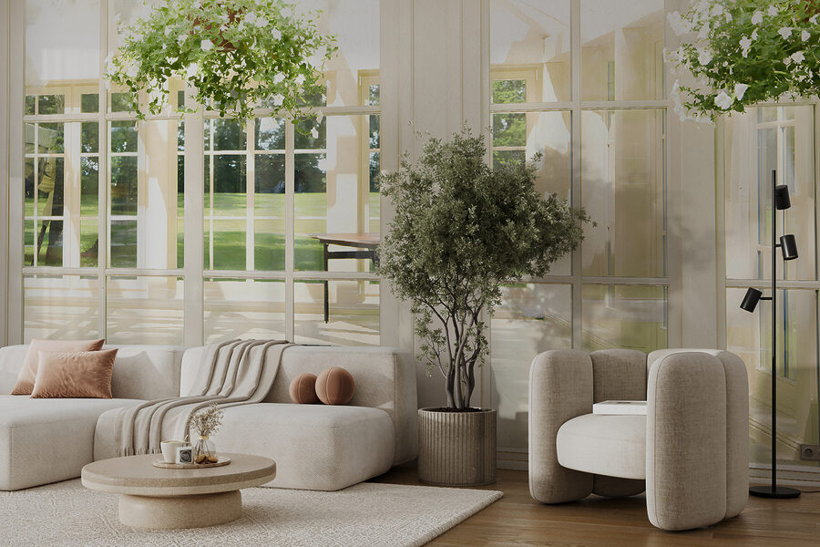 1 avaliação de Papel de parede Sala iluminada pelo sol com plantas suspensas