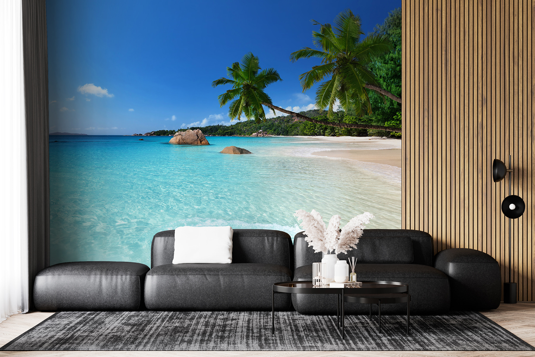 Transforme essa parede em branco num refúgio tropical com este deslumbrante mural de palmeiras sob um céu azul brilhante pontilhado de nuvens fofas. É como convidar um pedaço do paraíso diretamente para a sua casa. Imagine acordar, beber café e sentir-se como se estivesse numa praia de areia em vez de na sua sala de estar. Este mural cria sem esforço uma vibração relaxante, perfeita para um recanto de leitura acolhedor ou uma área de jantar animada. Os amigos podem esquecer-se que estão dentro de casa – até irem buscar os aperitivos! Abrace o encanto da praia e deixe as boas vibrações entrarem.