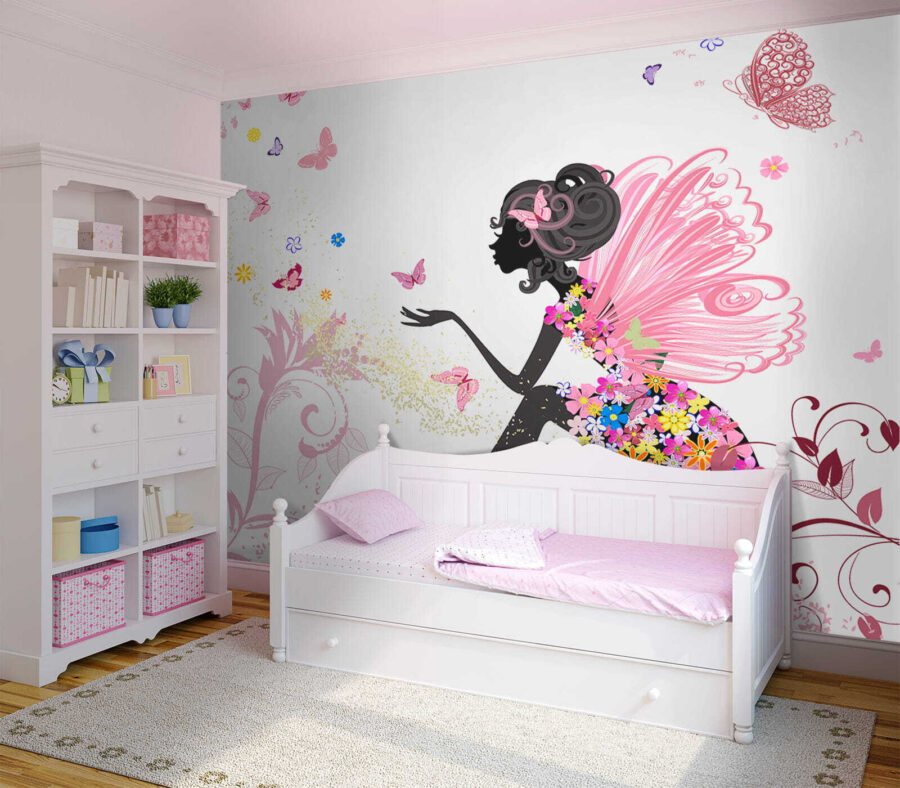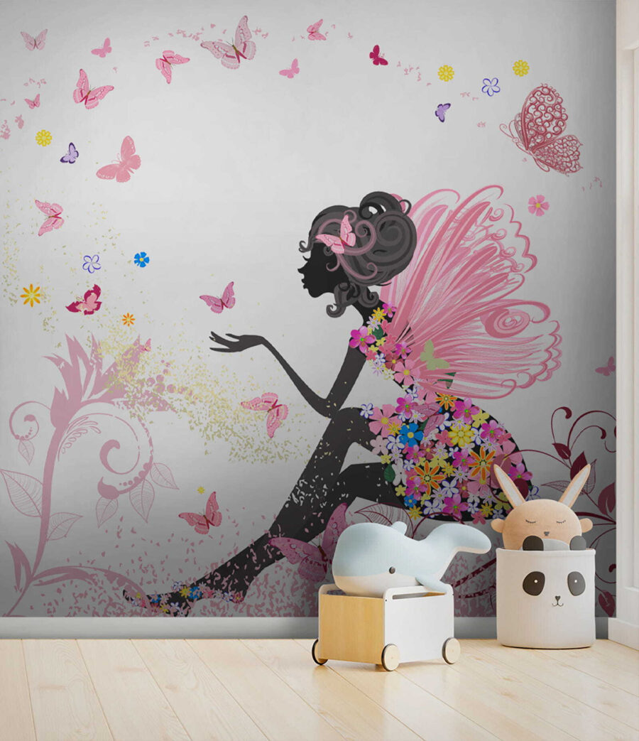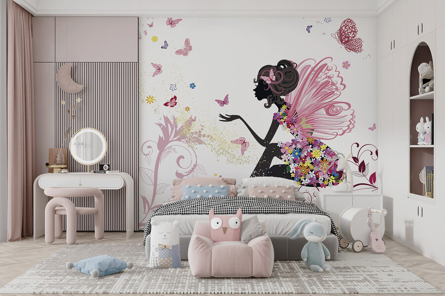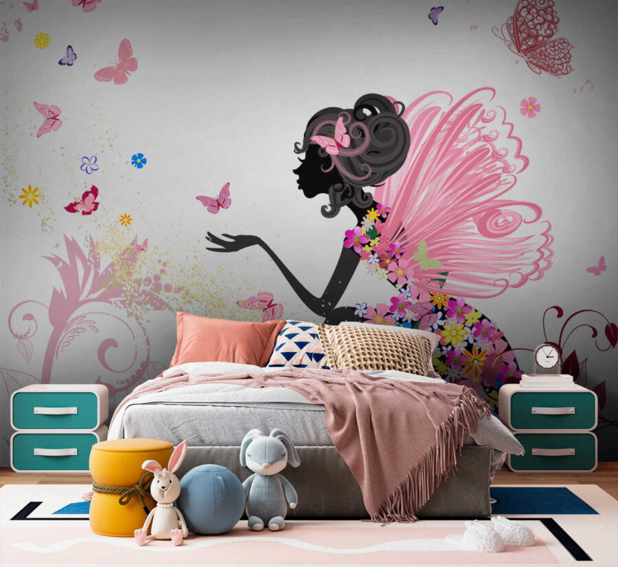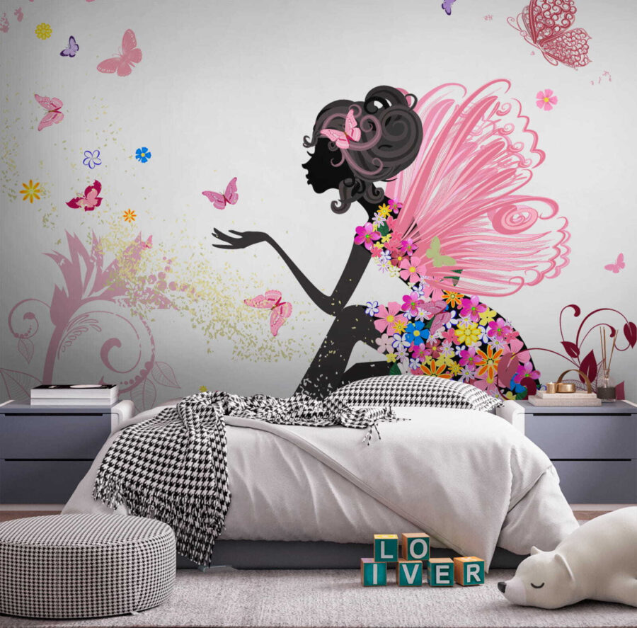 Este mural encantador, “Perfil de uma mulher com uma borboleta no cabelo”, é o toque perfeito para o quarto do seu filho. Imagine uma silhueta deslumbrante de uma mulher graciosamente rodeada de borboletas esvoaçantes, como se estivesse num jardim secreto. Os rosas suaves e as flores caprichosas dão um toque de magia – é como ter um conto de fadas na parede!