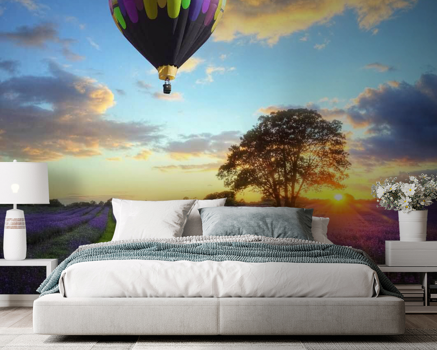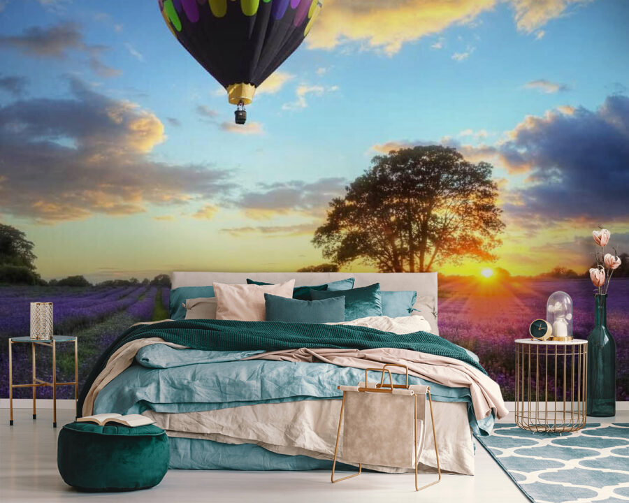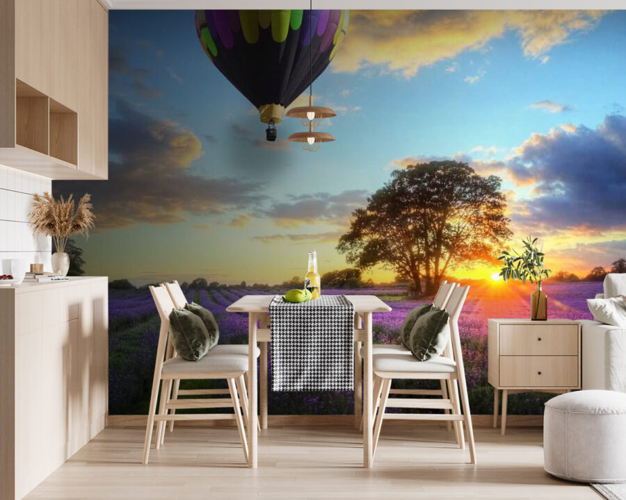 Imagine isto: um campo repleto de flores de lavanda vibrantes, sob um céu pintado com os tons quentes do pôr do sol. E ali, flutuando graciosamente acima de tudo, um grupo de balões de ar quente caprichosos, como sonhos coloridos a voar. Este mural não serve apenas para decorar — convida todos a sonhar acordados e a escapar para um mundo sereno. Imagine entrar no seu espaço e sentir uma brisa suave de calma a envolver-te, como se tivesses entrado no teu próprio refúgio tranquilo. É como ter umas mini-férias na tua parede! Perfeito para qualquer divisão que precise de uma dose de alegria, sussurra suaves histórias de aventura e da beleza da natureza. Ideal para quem gosta de flores, de contemplar o céu ou apenas de um pouco de magia na vida quotidiana. Quem não gostaria de flutuar em um passeio de balão colorido sobre um mar de lavanda?
