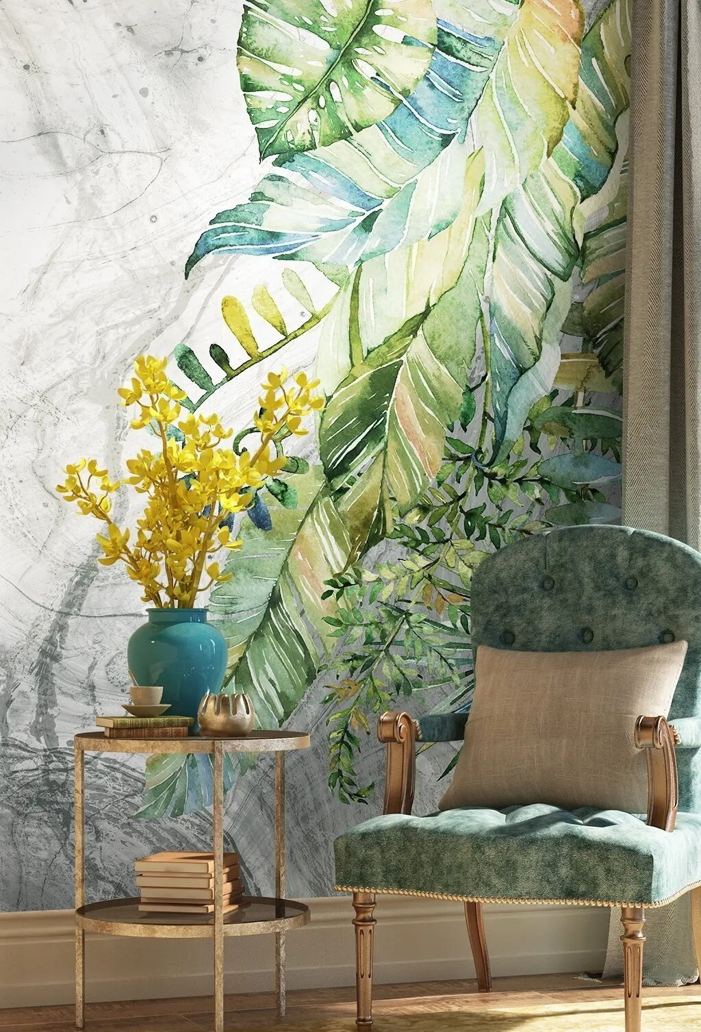 Transform your space with this stunning wall mural, “Leaves on a Marbled Surface.” Picture it: those vibrant greens dancing against a marbled backdrop, bringing a hint of nature right into your home. Imagine waking up and feeling like you’ve stepped into a cozy jungle, minus the mosquitoes, of course! Each leaf seems to whisper stories of calm and tranquility, while the soft marbling adds depth—perfect for a living room or even a chic home office.