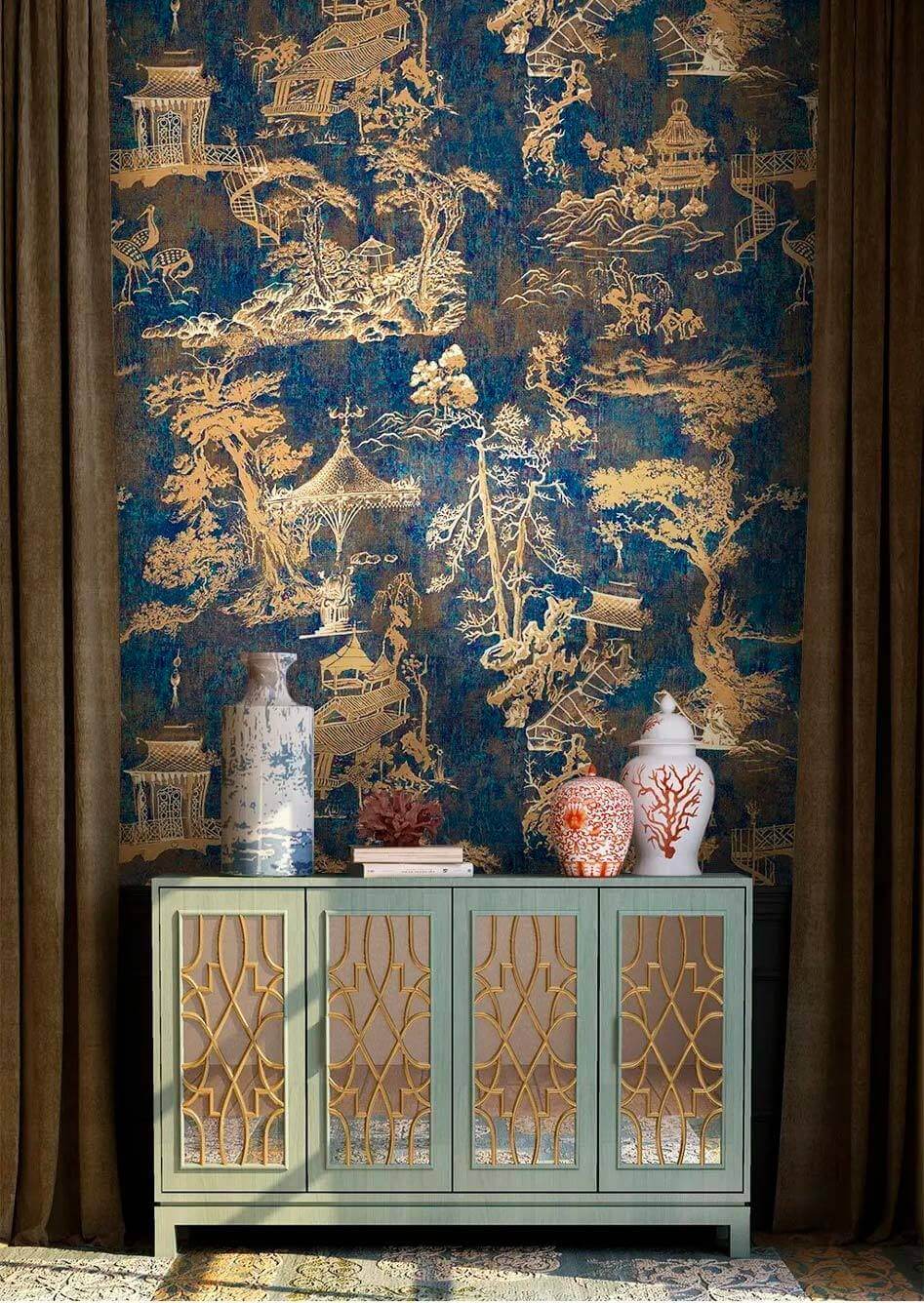 Transforme o seu espaço com este impressionante mural de parede com padrões intricados numa tela azul profundo. Imagine entrar num mundo sereno onde pássaros elegantes voam em torno de pagodes pitorescos, rodeados por árvores exuberantes e paisagens tranquilas. É como ter um jardim zen tranquilo na sua sala de estar, sem precisar ter jeito para jardinagem! Cada detalhe desperta a curiosidade, tornando-o um tema de conversa perfeito quando você recebe visitas. O tom azul profundo cria uma atmosfera acolhedora, ideal para relaxar com um bom livro ou saborear um chá. Quem diria que a arte de parede poderia ser tão encantadora? Este mural não serve apenas para decorar uma parede; ele traz uma sensação de calma e admiração a qualquer ambiente.