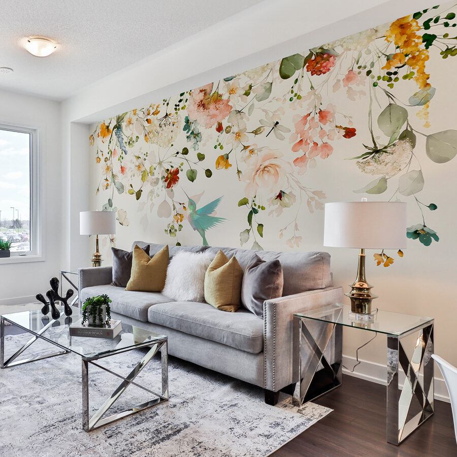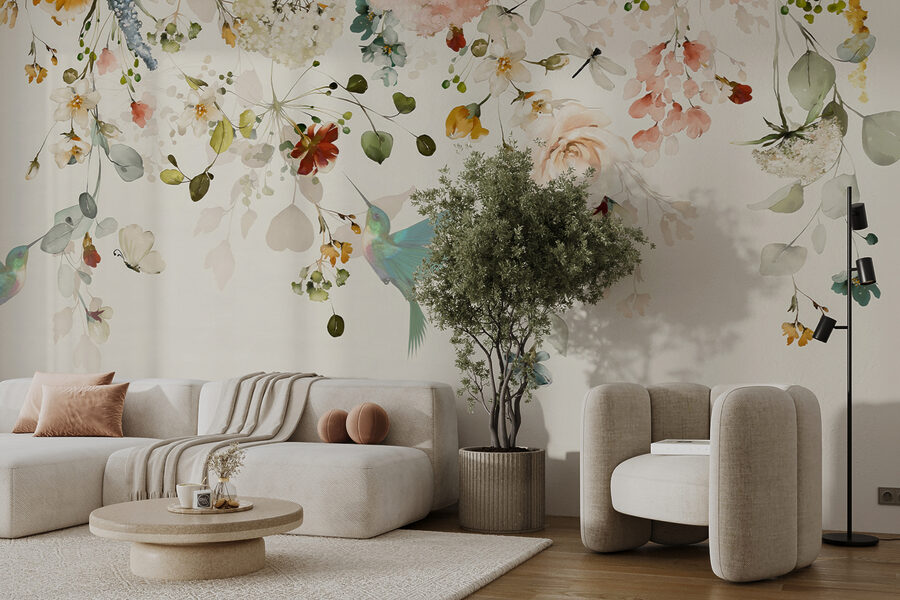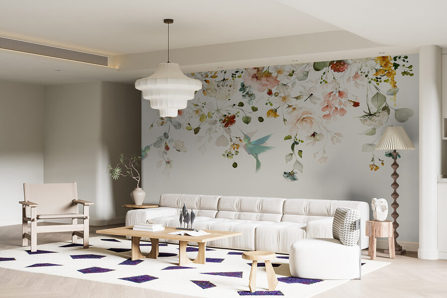 Este mural tem uma beleza serena que é simplesmente… calmante. Esses tons pastel e detalhes intrincados? Dão-lhe um ar acolhedor e elegante. Além disso, aquele beija-flor – tão giro e caprichoso, certo? É quase como se conseguíssemos ouvir o zumbido das suas pequenas asas. Quer esteja a enrolar-se com um livro ou a conversar com amigos, este mural cria um cenário maravilhosamente tranquilo.